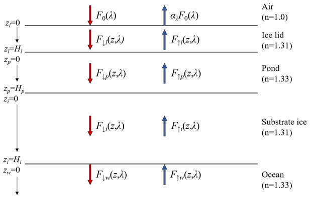 In this model, sea ice is treated as isotropic under the assumption of diffuse incident solar irradiance. The upward and downward irradiance of each layer can be described as in (Lu et al., 2016):
