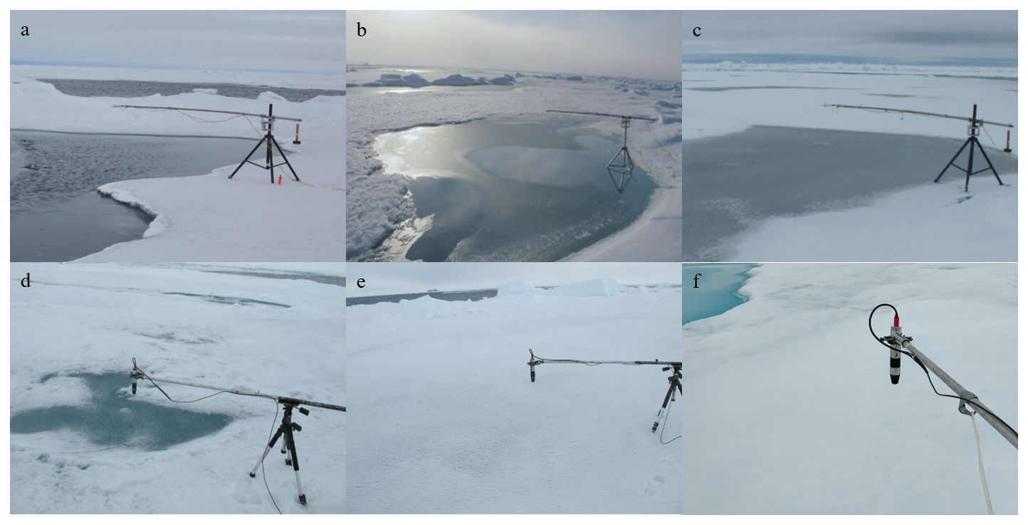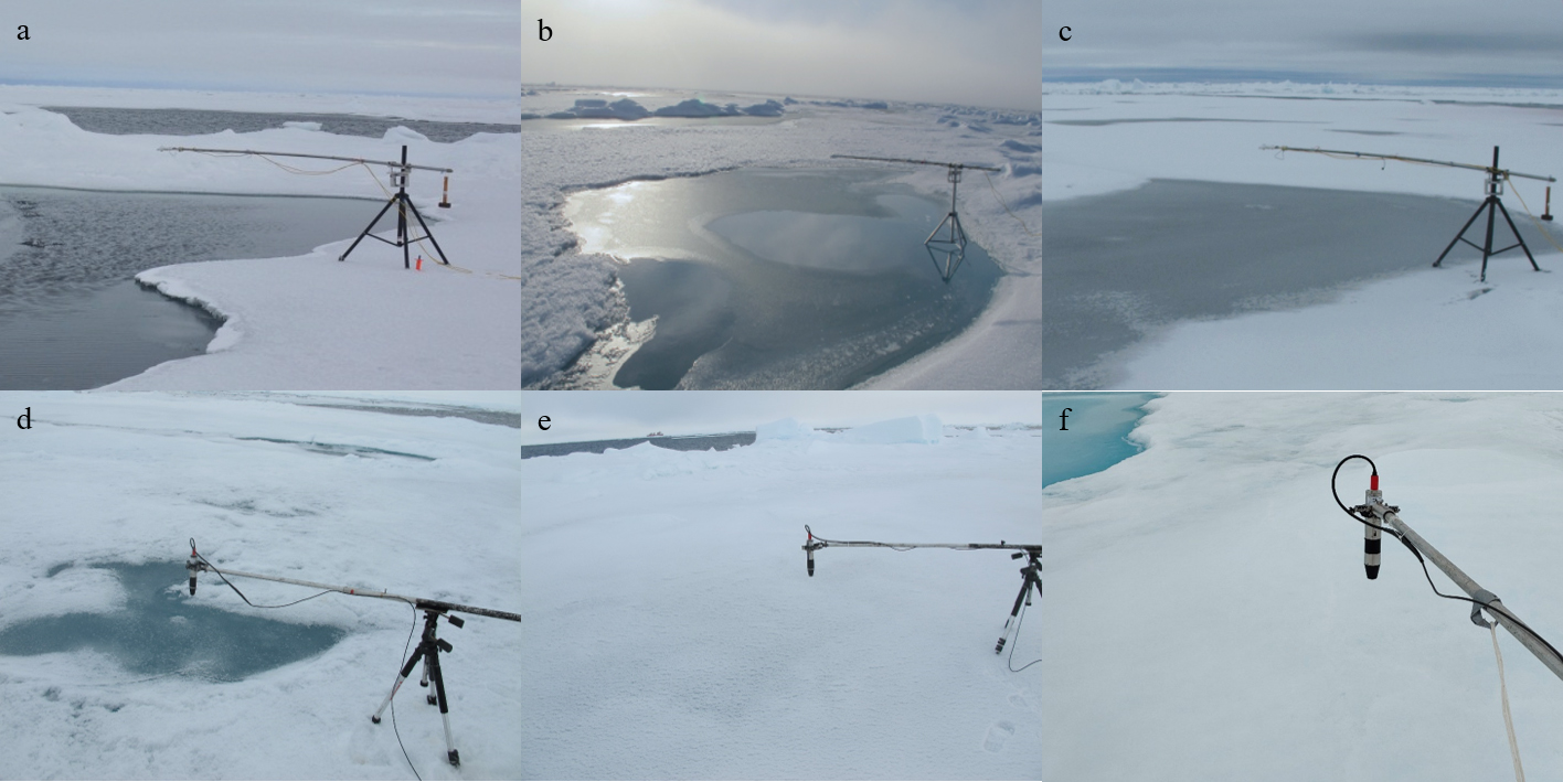 The sea ice surface is heterogeneous and often a mixed presence with water, snow and ice, therefore with varied albedo conditions. As a result, the melt pond observed are classified into five categories, namely water pond, water-ice pond, ice pond, ice-snow pond, and snow pond, based on the photo recorded during each observation which shows the surface state of melt pond and the setup of optical sensors. Typical states of the five types and the unponded ice are shown in Fig. 4. Specifically, the water pond (Fig. 4a) is defined as a melt pond with a surface of liquid water that has not yet started refreezing; the surface of a water-ice pond (Fig. 4b) is partly frozen yet not covered completely by the ice lid; the ice pond is when a melt pond is entirely frozen on its surface with neither water nor snow (Fig. 4c); the ice-snow pond is defined as a melt pond with ice lid partially covered by snow (Fig. 4d); the snow pond (Fig. 4e) is defined as a melt pond with its surface frozen and totally covered by snow, which makes it hard to distinguish from the snow-covered unponded sea ice (Fig. 4f). And it should be noted that all types of melt ponds mentioned above, except for water pond, have liquid water underneath their lids.