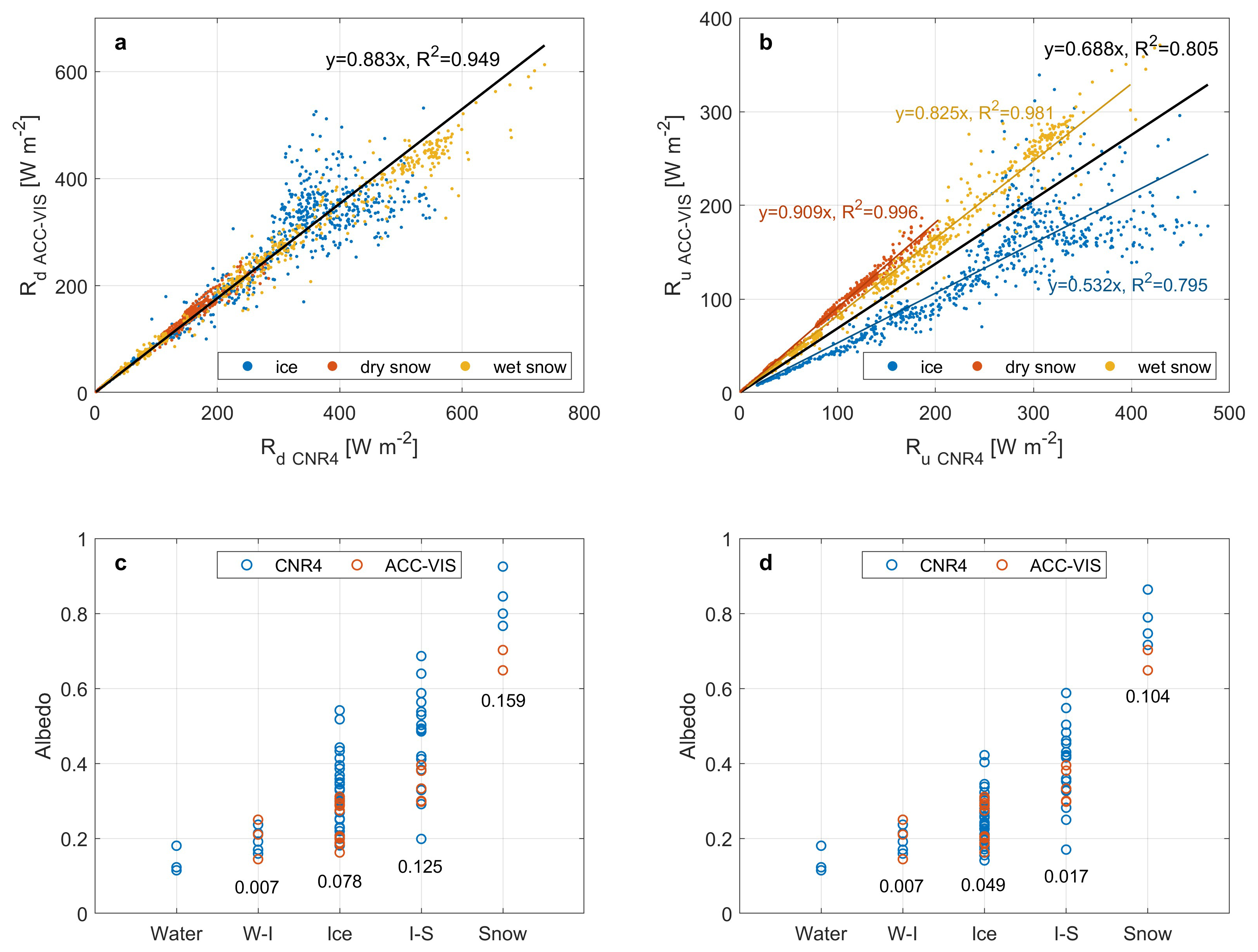 Figure 5(a) Downward integrated irradiance, (b) upward integrated irradiance, (c) raw albedo and (d) calibrated albedo measured by CNR4 and Ramses ACC-VIS for different surface states and types of ponds. The solid lines in panels (a) and (b) are the linear fitting for ice (blue), dry snow (red), wet snow (yellow) and overall (black), with the annotations showing the fitting coefficients. The annotations in panel (c) and (d) represents the mean deviation of each type between two instruments. The abbreviation W-I represents water-ice pond and I-S represents ice-snow pond.