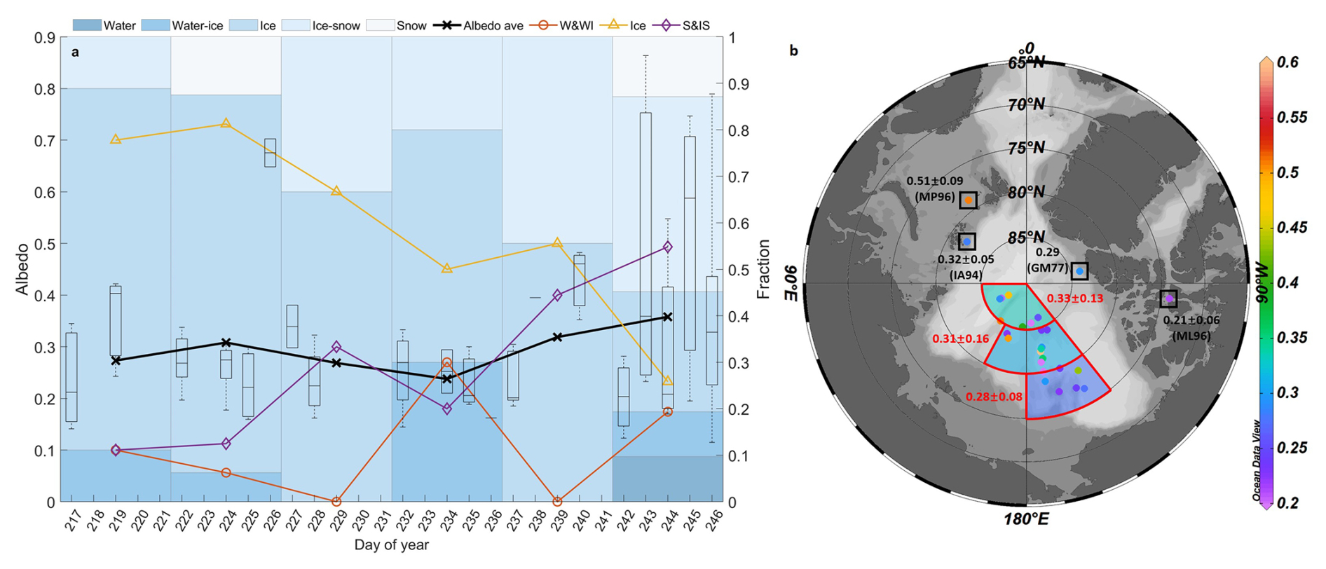 Figure 6The temporal (a) and spatial (b) distribution of total albedo of melt ponds. In panel (a), the boxplot represents the albedo of melt ponds observed in certain DOY (day of year), bars represent 5 d average proportions (axis at the right side) of each type of pond, the black solid line is the 5 d average of albedo, dashed lines represent 5 d average of proportions (axis at the right side) of water and water-ice (red) pond, ice (yellow) pond, ice-snow and snow (purple) pond, respectively. In panel (b), the colorbar represents the albedo of melt pond, the annotations in red represent mean and deviation of pond albedo in certain regions, the annotations in black represent mean and deviation of pond albedo reported in previous studies, where the acronym is as follows: GM77 – Grenfell and Maykut (1977); IA94 – Ivanov and Alexadrov (1994); ML96 – Morassutti and Ledrew (1996); MP96 – Makshtas and Podgorny (1996). Schlitzer, Reiner, Ocean Data View, http://odv.awi.de, 2023.