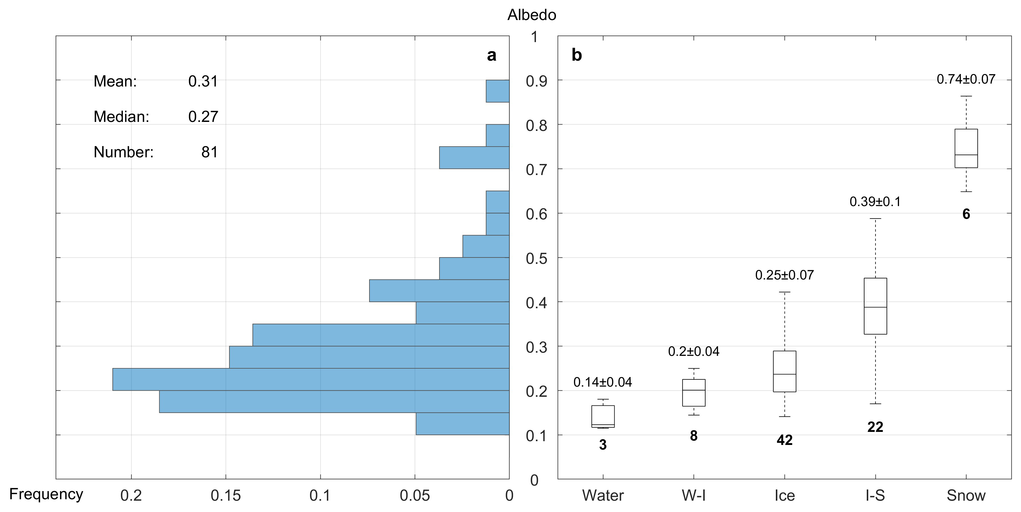 Figure 7Albedo distribution of all melt ponds observed with (a) frequency and (b) types of surface states, where W-I represents water-ice pond and I-S represents ice-snow pond. The total numbers of ponds sampled for each type are annotated by the bold number under the boxplot in panel (b).
