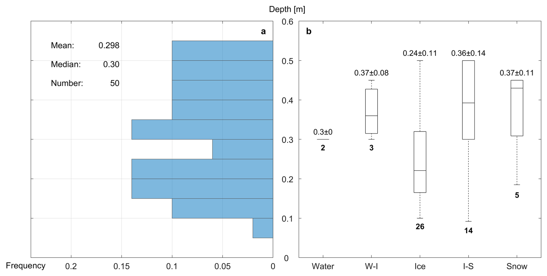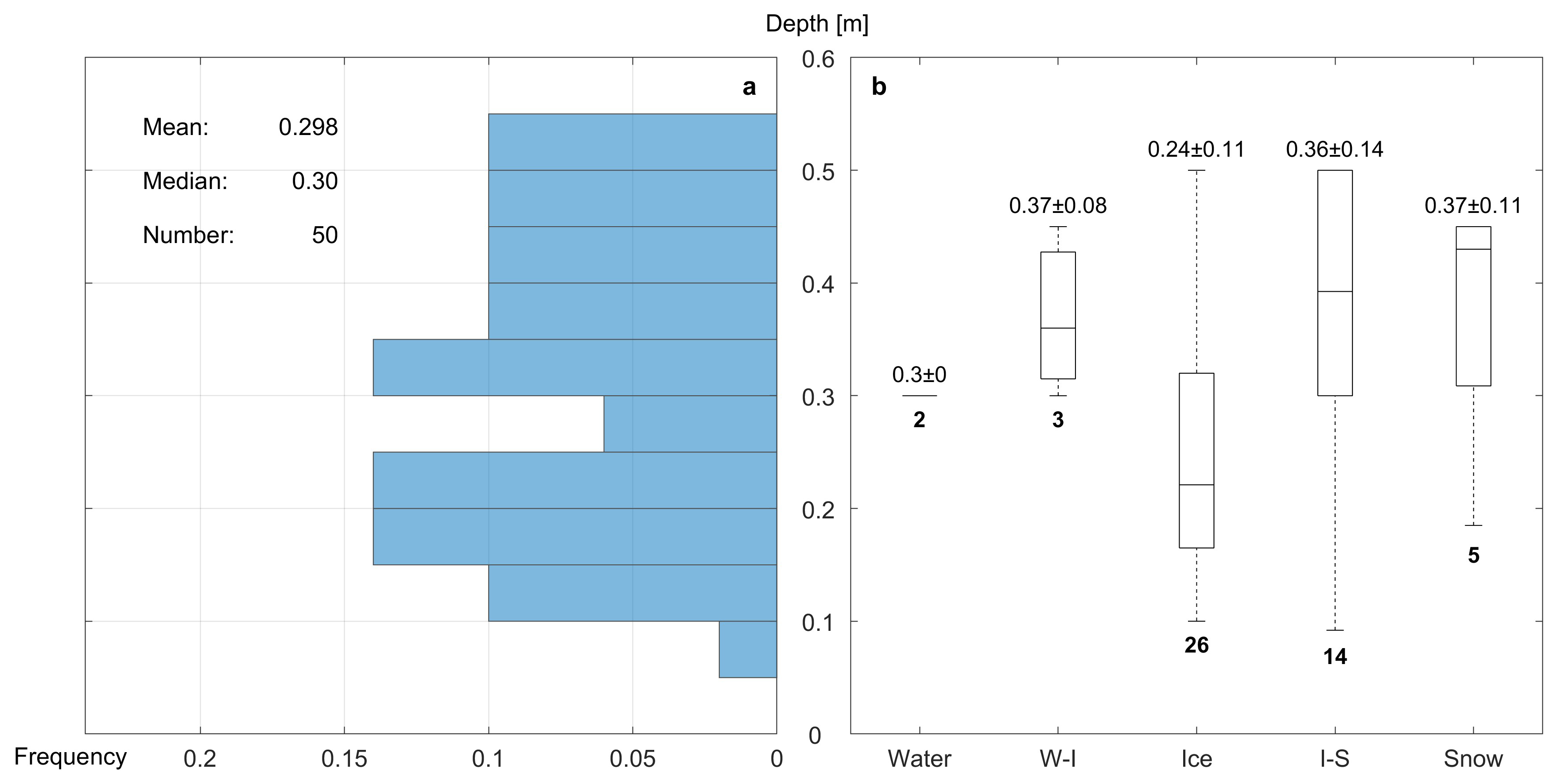 Figure 9Distribution of the depth of melt ponds with (a) frequency and (b) types of surface states, where W-I represents water-ice pond and I-S represents ice-snow pond. The total numbers of ponds sampled for each type are annotated by the bold number under the boxplot in panel (b).