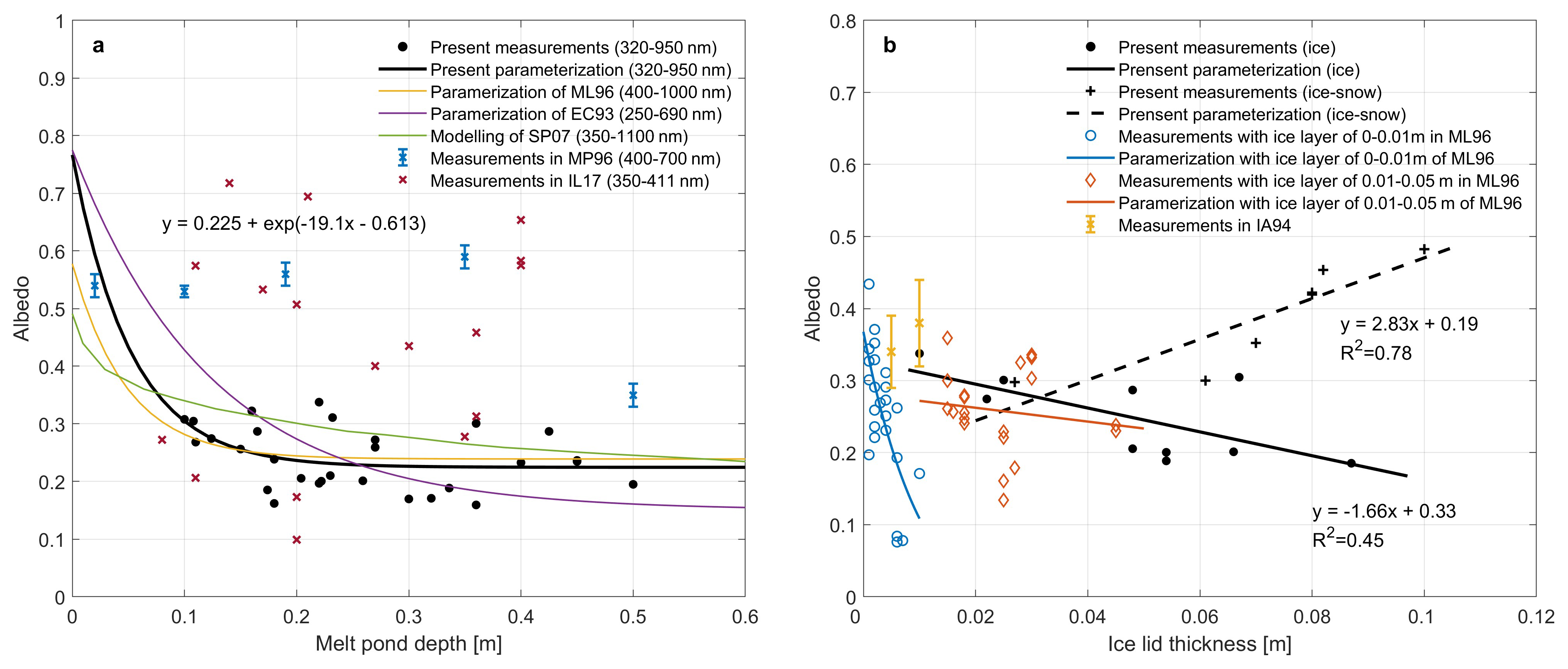 Figure 10The fitting results for (a) albedo and melt pond depth, (b) albedo and ice lid thickness. In panel (a), solid lines represent fitting in different studies and dots are the measured albedo, where the acronym is as follows: ML96 – Morassutti and Ledrew (1996); EC93 – Ebert and Curry (1993); SP07 – Skyllingstad and Paulson (2007); MP96 – Makshtas and Podgorny (1996); IL17 – Istomina et al. (2017). In panel (b), the lines represent fitting in different studies and dots are the measured albedo, where the acronym is as follows: ML96 – Morassutti and Ledrew (1996); IA94 – Ivanov and Alexadrov (1994).
