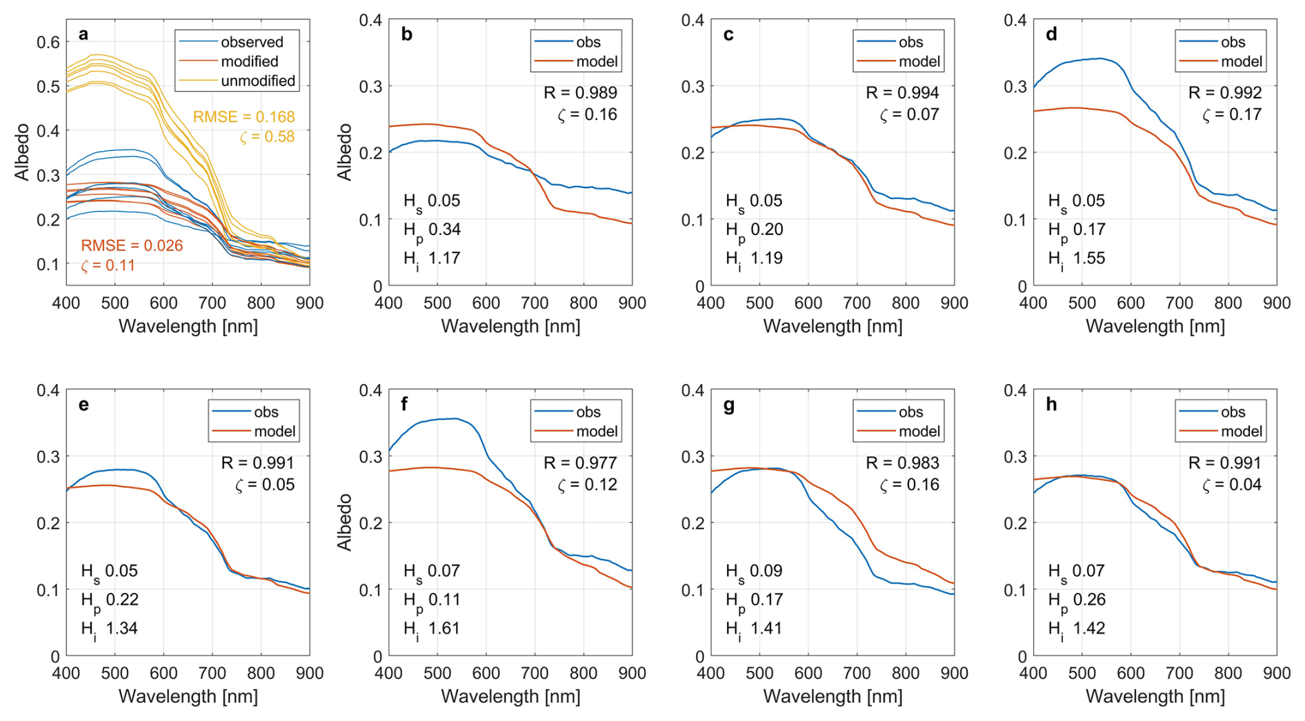 Figure 11The observed and simulated values of spectral albedo for melt ponds, where (a) shows the observed albedo, and the result of model with and without modification of all ponds. The annotations in panel (a) show the average value of the results in corresponding color, where RMSE represents root mean square error) and ζ represents relative error. Panels (b)–(h) present the result of each pond separately, where R represents correlation coefficient, ζ represents relative error, Hs is the ice lid thickness, Hp is the melt pond depth and Hi is the substrate ice thickness. The unit of Hs, Hp, and Hi is meter.