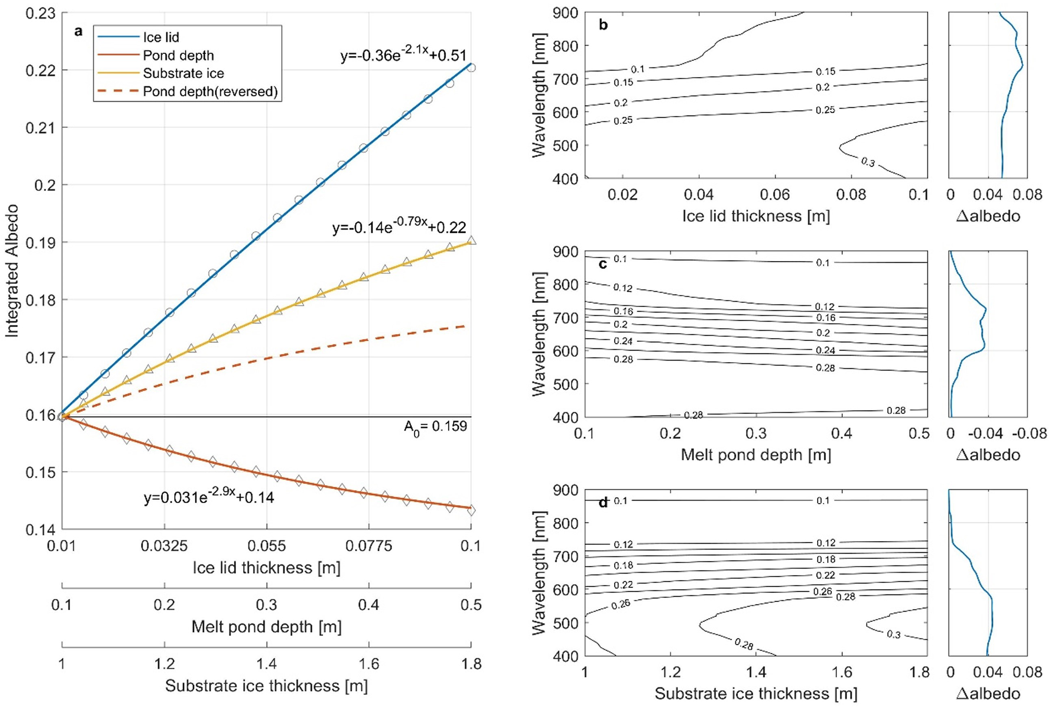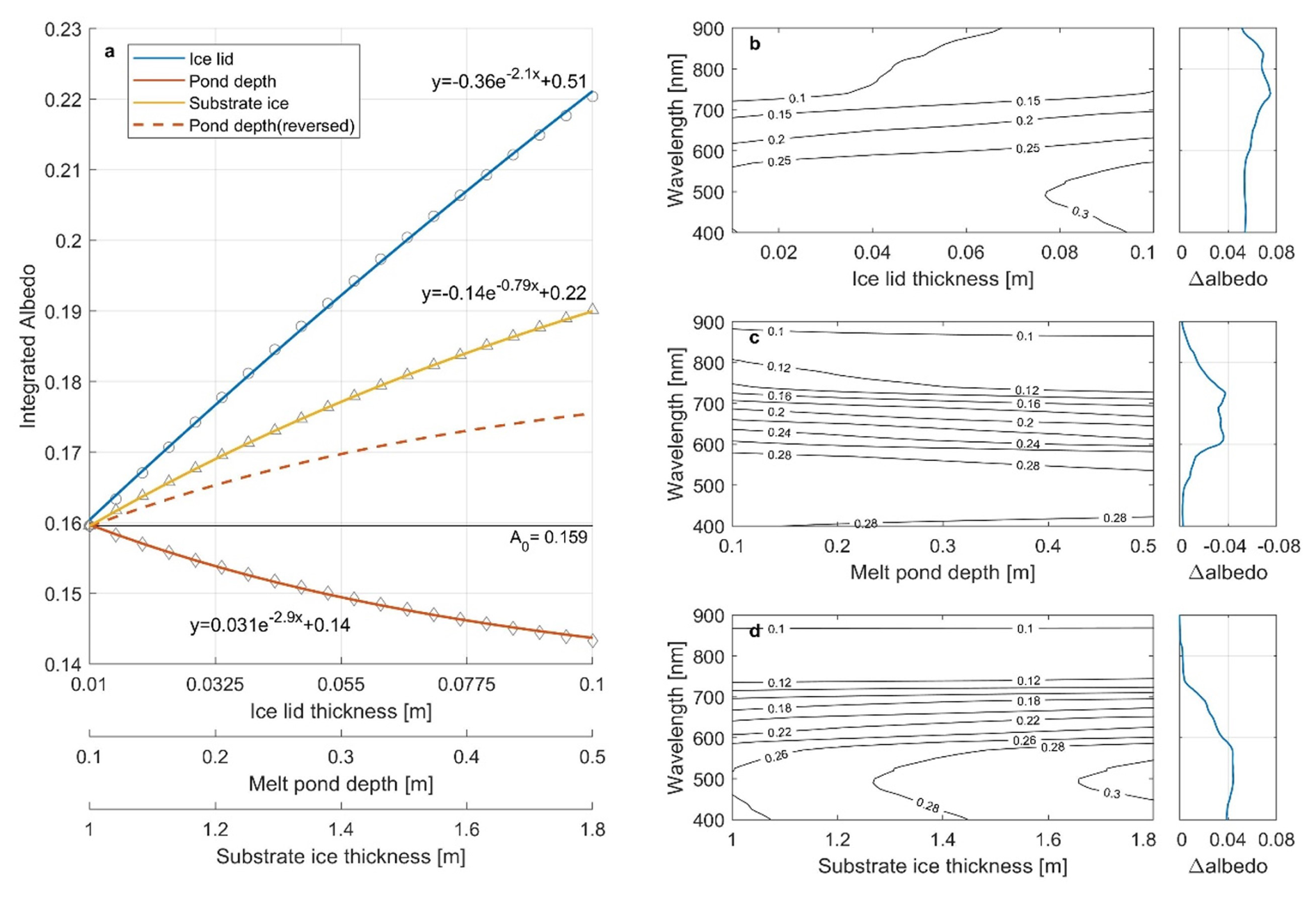 Despite that this model lacks the evaluation of spectral albedo from substrate ice, it is accurate and valid in the simulation of total albedo. Based on the observation dataset, the intervals of 0.01–0.1, 0.1–0.5 and 1.1–1.8 m are taken as the distribution range for the ice lid thickness, melt pond depth and substrate ice thickness, assuming that it represents most melt ponds from early August to early September. The basal value A0 is 0.159 when all three variables are set to the minimum values. Then the ice lid thickness, melt pond depth and substrate ice thickness is gradually increased to the maximum respectively to obtain the variation of albedo with each property (Fig. 12a). It can be concluded that the albedo of ice ponds during freezeup is determined firstly by the ice lid, secondly by the substrate ice, and finally the pond depth. In addition, exponential fits for the total albedo and different properties are also provided, which may conduce to the albedo estimation for melt ponds in certain state.
