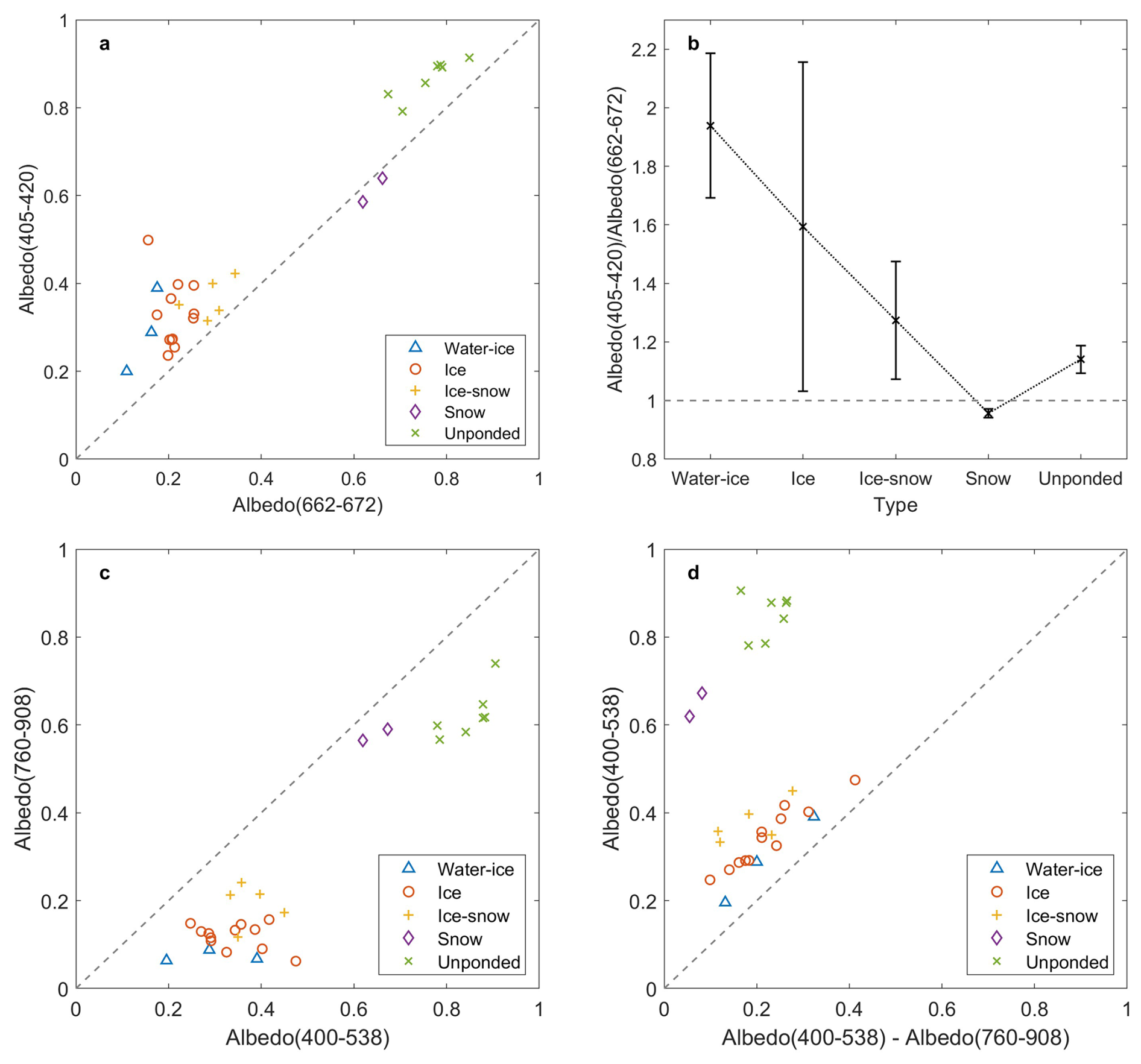 Figure 13The ratio of spectral albedo between 405–420 and 662–672 nm for (a) all ponds and (b) different types, and scatterplots for albedo ratio between different bands following (c) PCA Algorithm (Rösel and Kaleschke, 2011) and (d) LinearPolar Algorithm (Wang et al., 2020a), where numbers in the brackets represent the limits of the integral albedo.