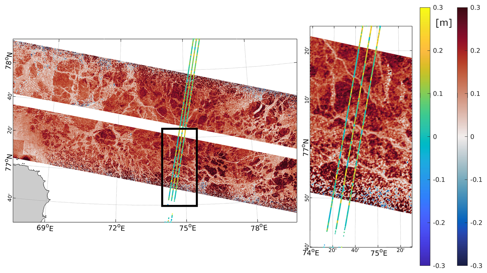Figure 3Example of SWOT swath (blue to red colorbar) and ICESat-2 (rainbow coloured) surface height observations (left) and zoom (location indicated by black box) on southern SWOT swath (right) on 23 January 2024 in the Kara Sea (see Fig. 2 pink rectangle) without subtraction of absolute mean values and the treatment of outliers at the swath edge. Acquisition time differences: SWOT vs. ICESat-2, 13 min.