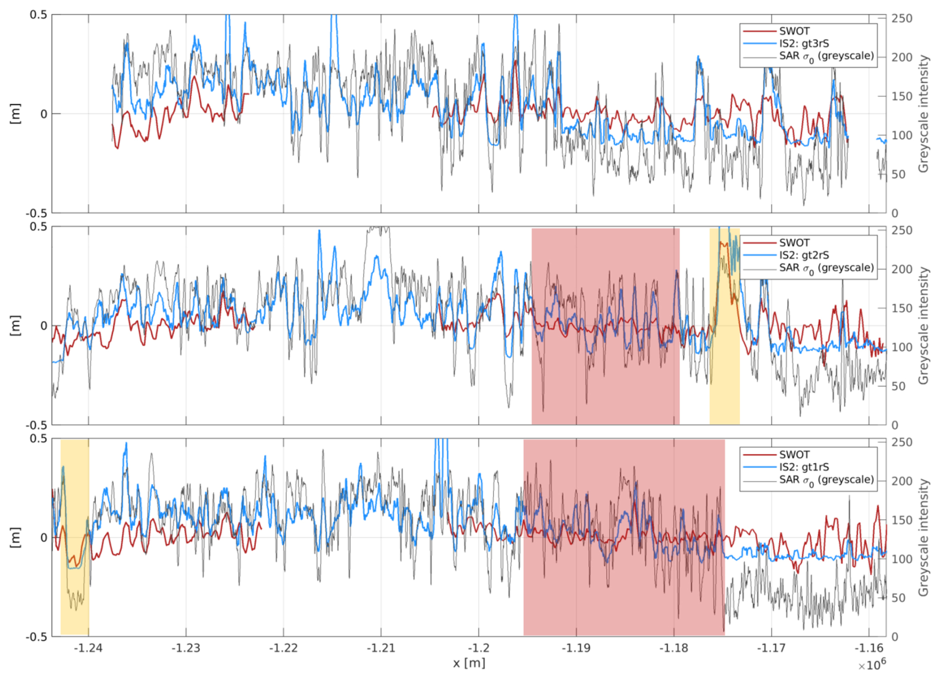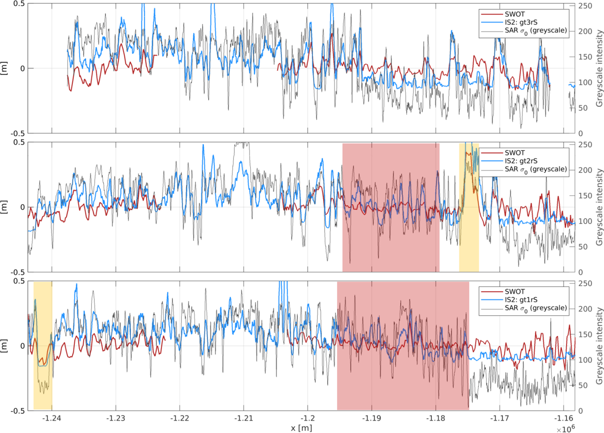 Figure 5Along-track height comparisons in the Canadian Archipelago (same area as in Fig. 4) for the three strong beams of ICESat-2 (blue). Interpolated SWOT heights in red and Sentinel-1 backscatter image converted to grey-scale values in grey (right axis). Orange highlighted sections show lead and floe areas; red areas show clearly dampened height variations of SWOT compared to ICESat-2. Note: Along-track height observations are zero-centred by reducing the mean per ground track (gt) and swath side.