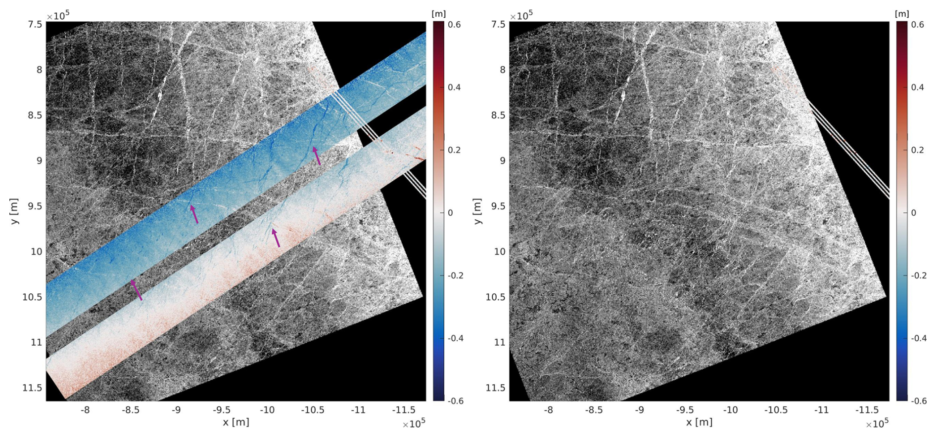 Figure 6Example of coloured SWOT surface elevation swath, ICESat-2 profiles and a Sentinel-1 image (left) and without SWOT for comparison (right) on 21 January 2024 in the Chukchi Sea (see Fig. 2 orange rectangle). Arrows indicate lead/ridge regions that are discussed in the text. Geographical coordinates are stereographic north projected (EPSG:3413). Acquisition time differences: SWOT vs. ICESat-2, 20 min.; SWOT vs. Sentinel-1, 38 min.