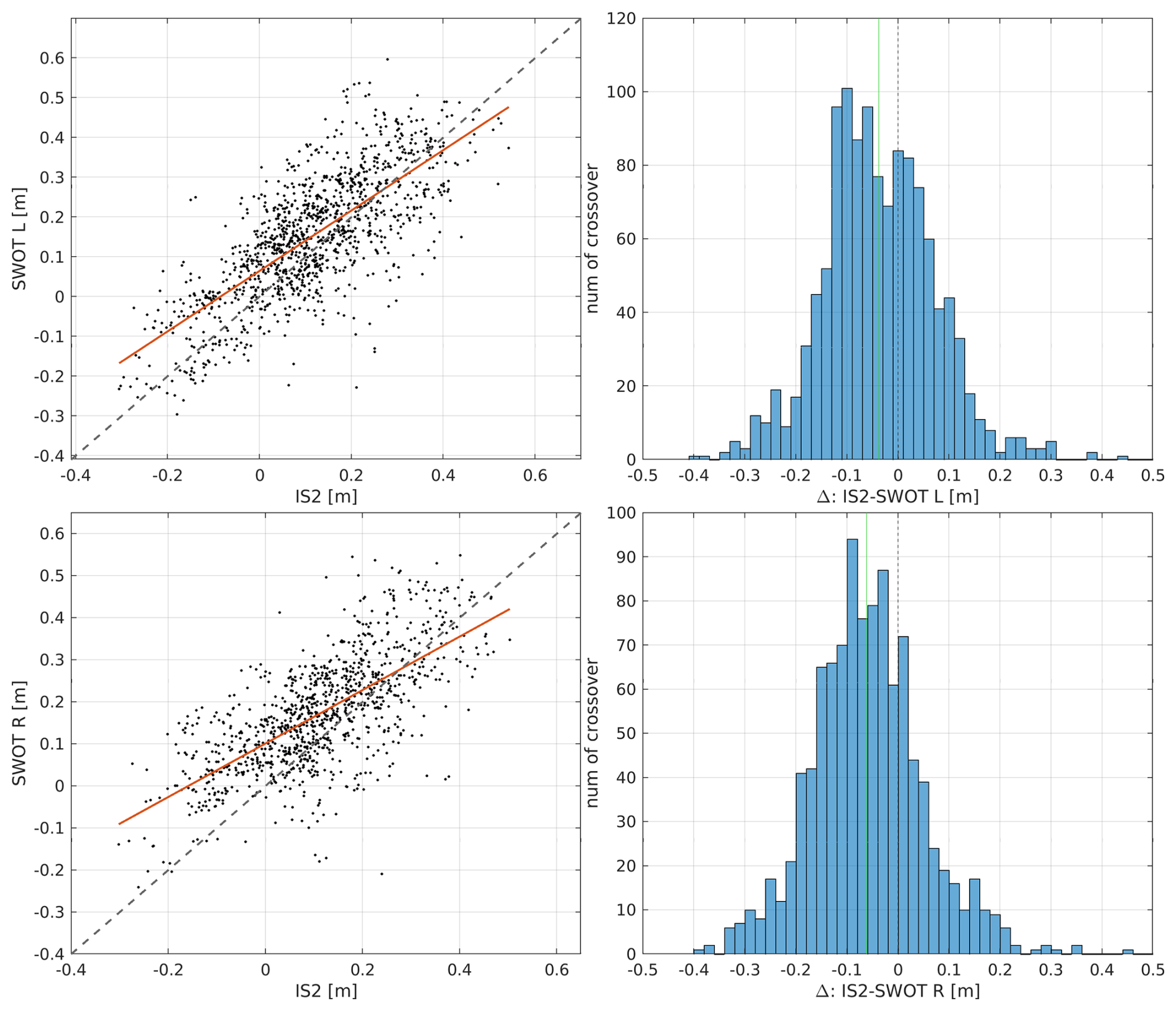 Figure 7Scatter plot of ICESat-2 surface height against interpolated SWOT surface elevations per crossover for all 3 beams with regression line (red) and bisectrix (dashed) with histograms of mean value differences for left (top row) and right (bottom row) SWOT swaths. In the histograms, the mean values (−4 cm for left and −6 cm for right swath) are indicated by the green line, while the zero line is indicated as a dashed line.
