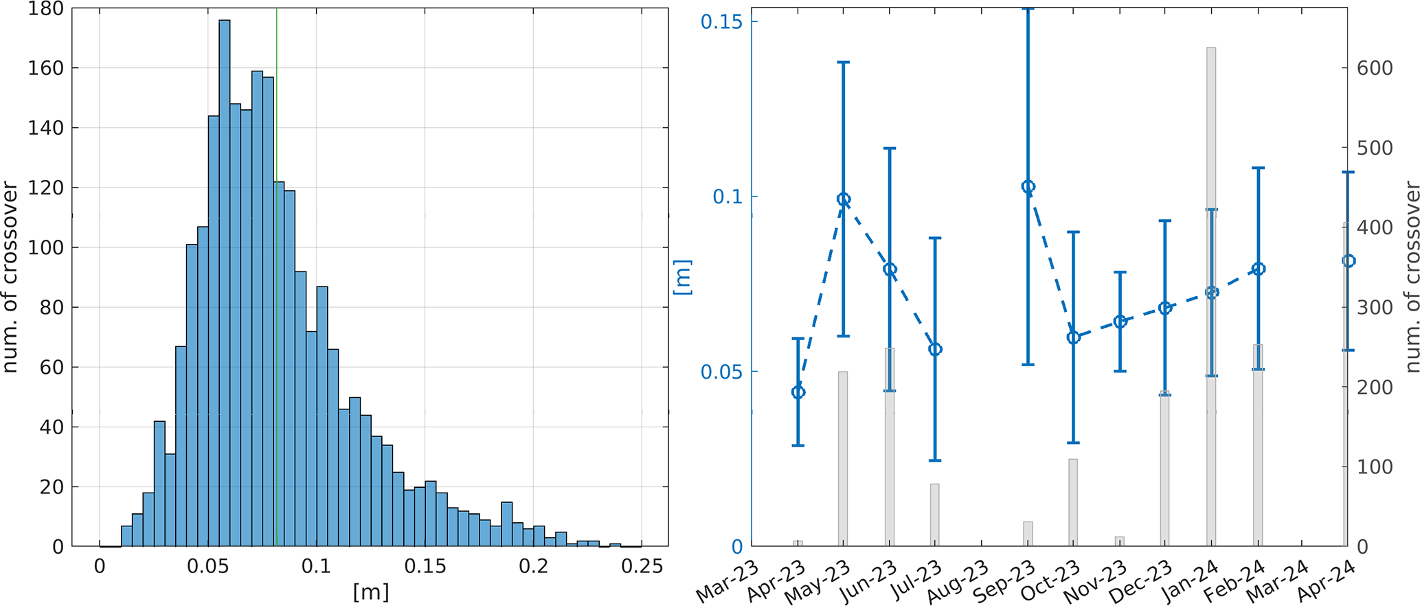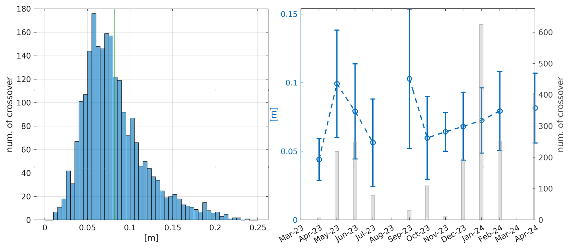 Figure 9Histogram (left) and monthly averaged evolution (right) of all standard deviations of point-wise surface elevation differences between interpolated SWOT swath values and strong ICESat-2 laser beams. Green line in histogram indicates mean value of 0.08 m
