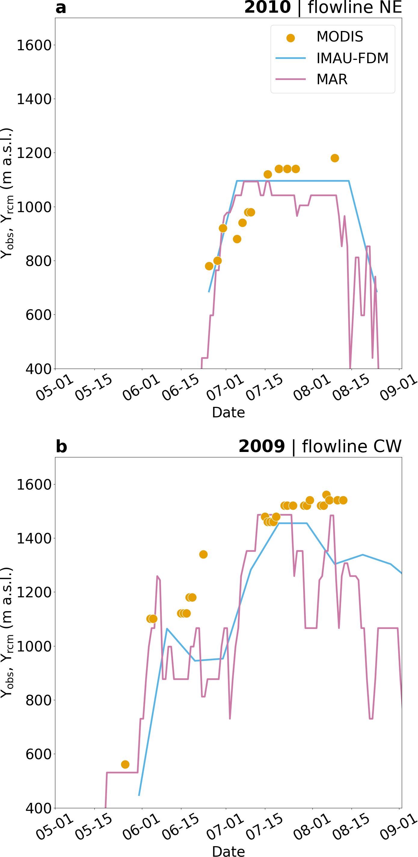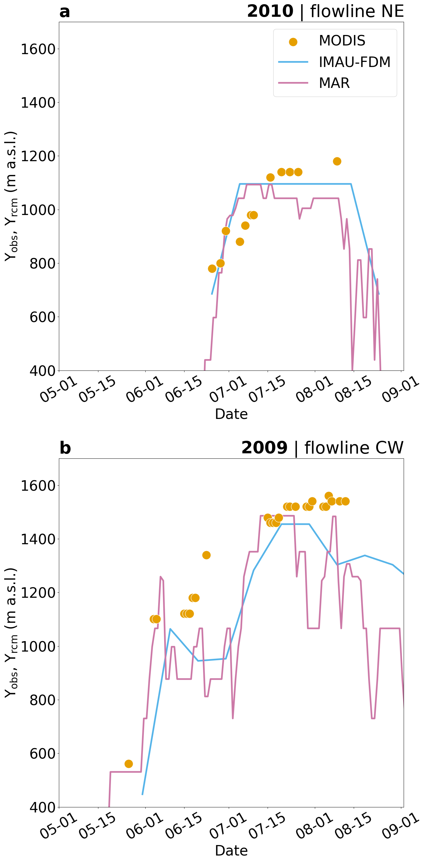 Figure 2Evolution of MODIS visible runoff limits Υobs and RCM simulate runoff limit Υrcm over two selected melt seasons and flowlines. Solid lines show RCM runoff limits at daily resolution for MAR and in 10 d steps for IMAU-FDM. Subplot (a) shows data for the transect NE for the year 2010, (b) shows the transect CW for the year 2009. See Fig. 1 for the location of the two transects shown.
