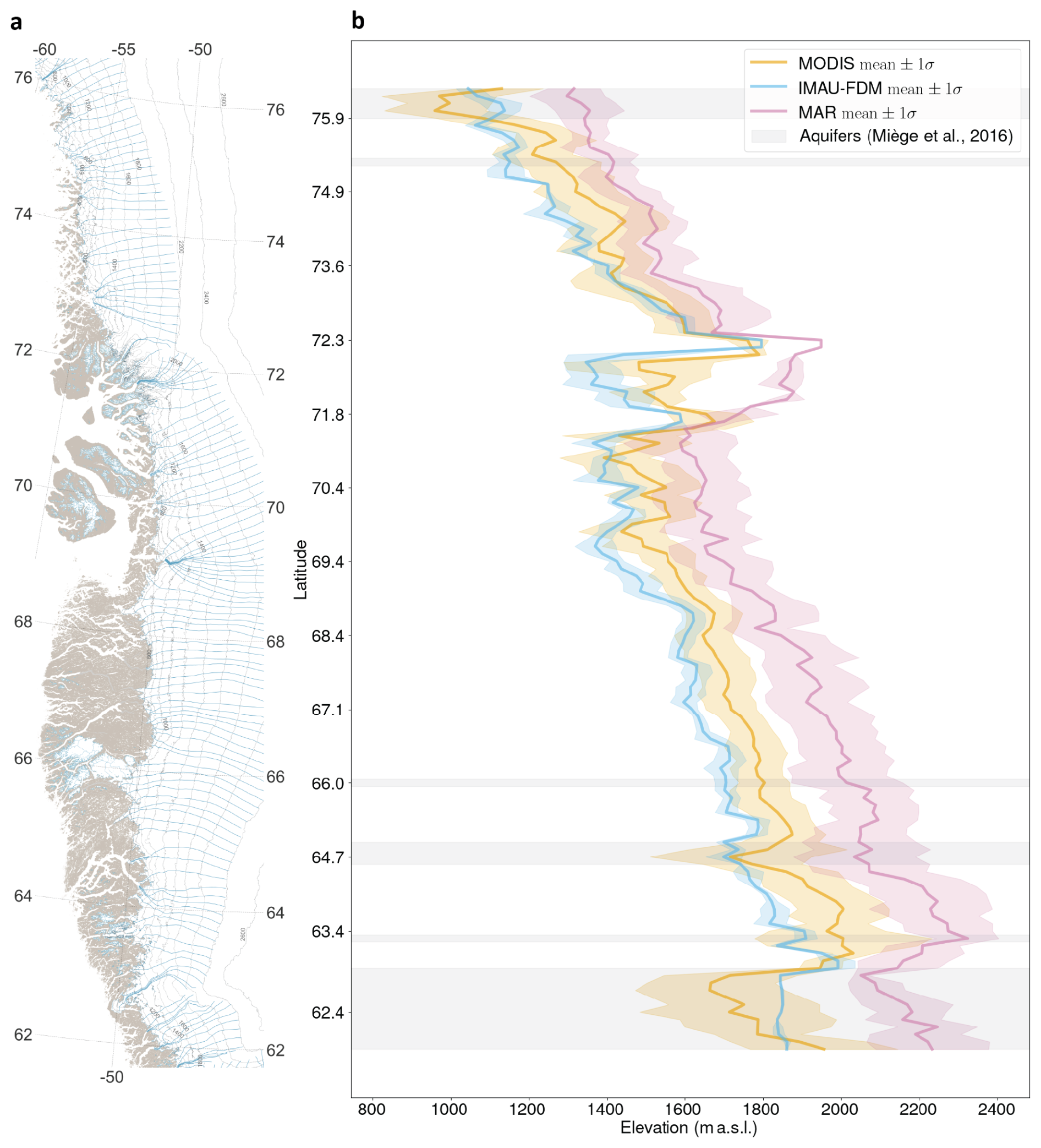 Figure 3The western slope of the Greenland ice sheet and mean MODIS, MAR and IMAU-FDM runoff limits, averaged over the time period 2000 to 2021. (a) Map of Greenland's west coast showing the flowlines along which the runoff limits have been calculated. (b) Mean and standard deviation of MODIS maxΥobs and maxΥrcm of MAR and IMAU-FDM for all flowlines that fall into the area shown. Gray shading indicates latitudes where firn aquifers occur (Miège et al., 2016).