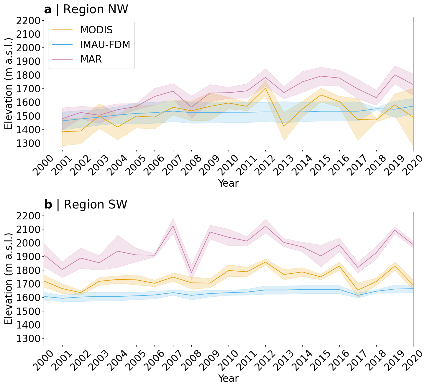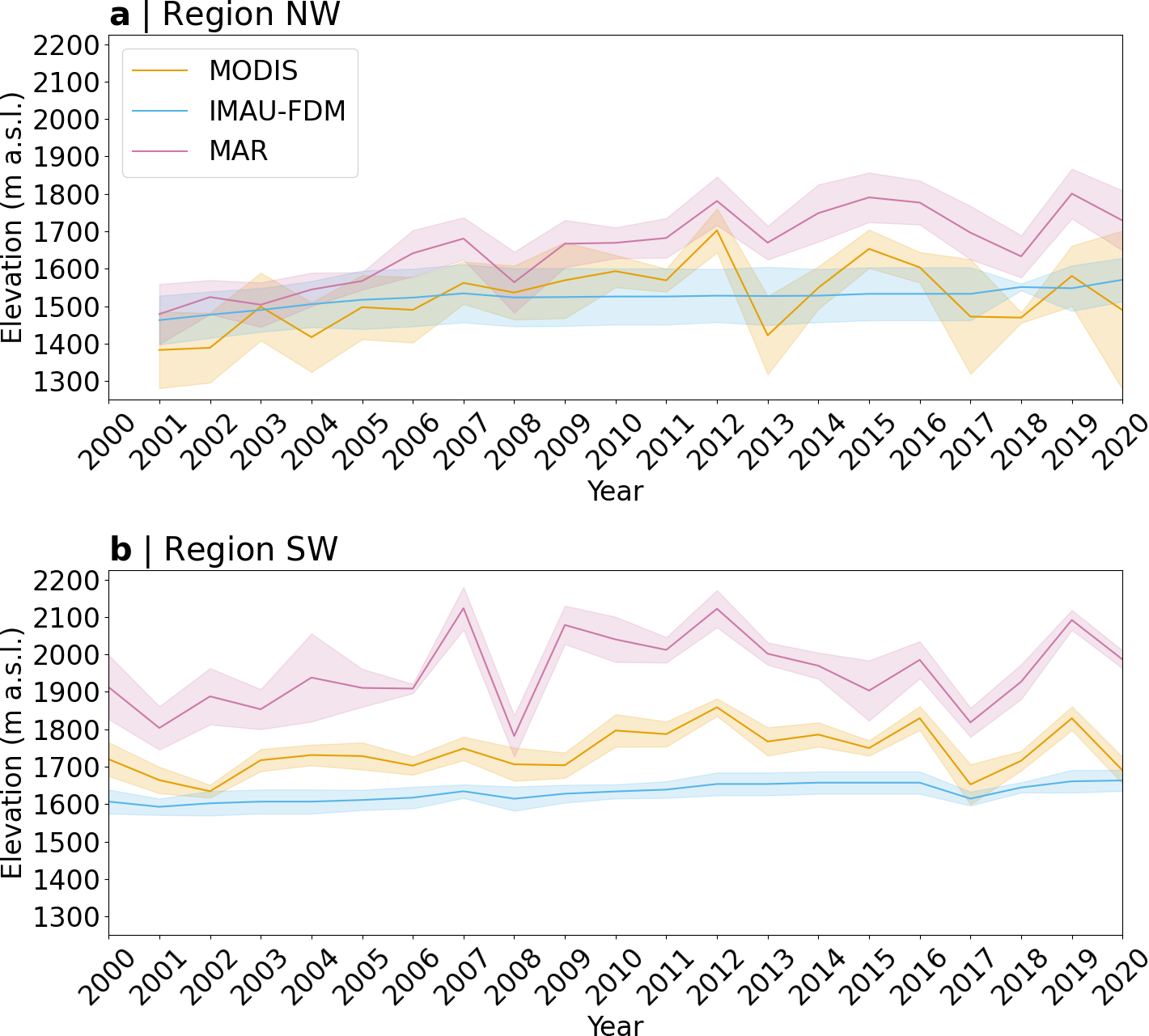 Figure 3 shows how maxΥobs and maxΥrcm vary along Greenland's western flank. The RCMs and MODIS show a general decrease of the runoff limit towards higher latitudes (Fig. 3b). Certain deviations from this trend are common to all data: maxΥobs and maxΥrcm are depressed south of ∼63° N and elevated in-between ∼71 and ∼72.5° N. Where firn aquifers are present, maxΥobs are biased low and standard deviation is increased. Otherwise, the differences between maxΥobs and maxΥrcm depend strongly on the RCM. IMAU-FDM simulated runoff limits are on average at 1545 m a.s.l., lower than maxΥobs which are on average at 1613 m a.s.l. IMAU-FDM have a low standard deviation of 31 m compared to MODIS (99 m). MAR maxΥrcm are at 1816 ± 94 m a.s.l., substantially higher than MODIS but with similar standard deviation. Figure 4 illustrates for two selected regions how maxΥobs and maxΥrcm fluctuate over time. IMAU-FDM simulated runoff limits vary little between the years. The intense melt seasons of 2012 and 2019 leave virtually no trace in its runoff limits. MAR maxΥrcm vary with the intensity of the melt season. Temporal variability of exceeds MODIS in the south (Fig. 4b), but is rather similar further north (Fig. 4a).