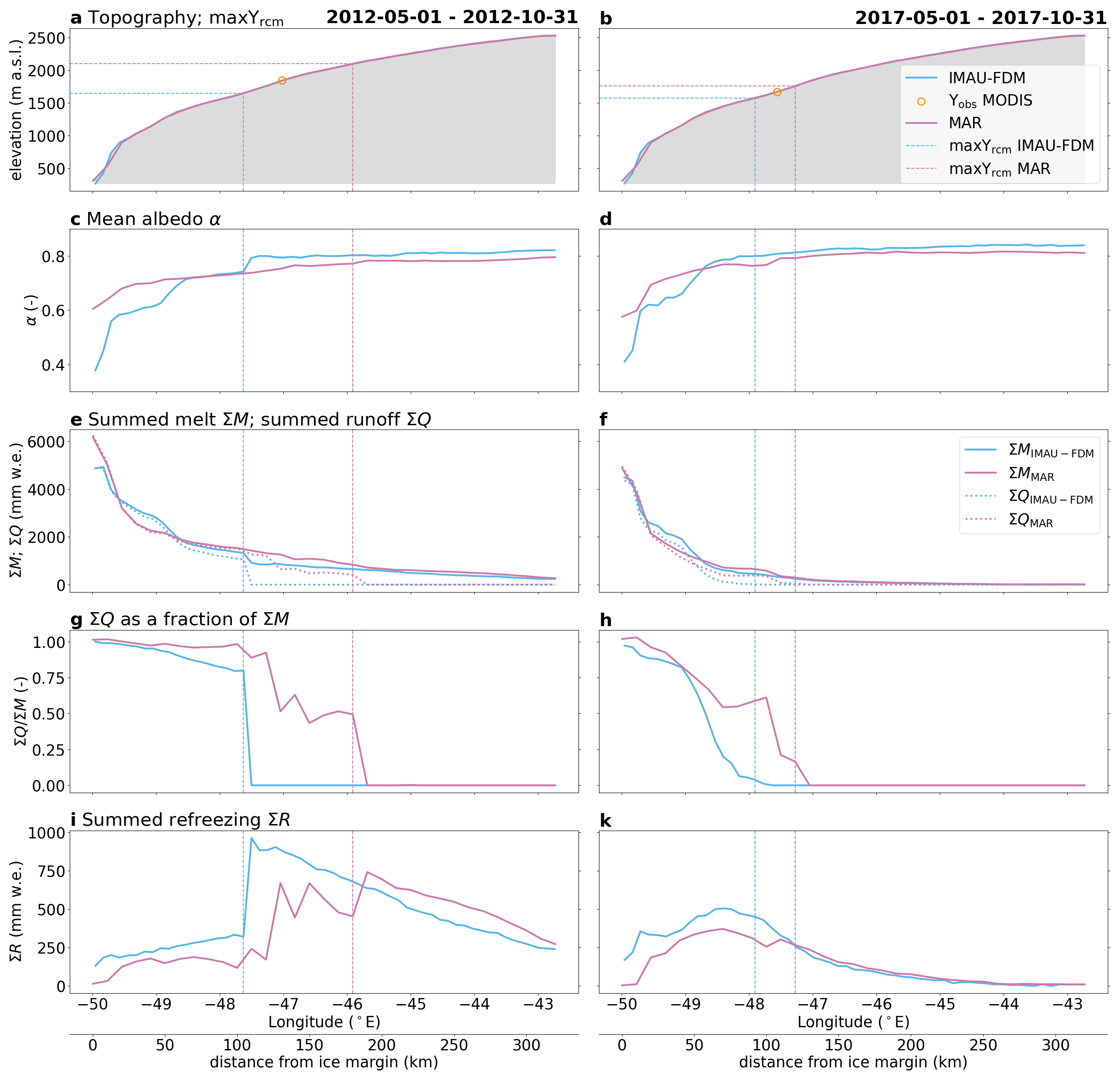 We find that in intense melt years, MAR simulates up to 29 % more runoff than IMAU-FDM along the K-Transect. This difference is mainly due to MAR runoff from above . All are located further inland than and in the year 2012, the distance between the two runoff limits reaches ∼75 km (Fig. 5a). While average MAR runoff between the two runoff limits is modest compared to average runoff over the RCM's common runoff area (Fig. 5e), the considerable distance causes total MAR runoff from above to become relatively large. In melt seasons of intermediate intensity, MAR and IMAU-FDM maxΥrcm are located closer to each other (Fig. 5b) and total runoff between them is relatively small.