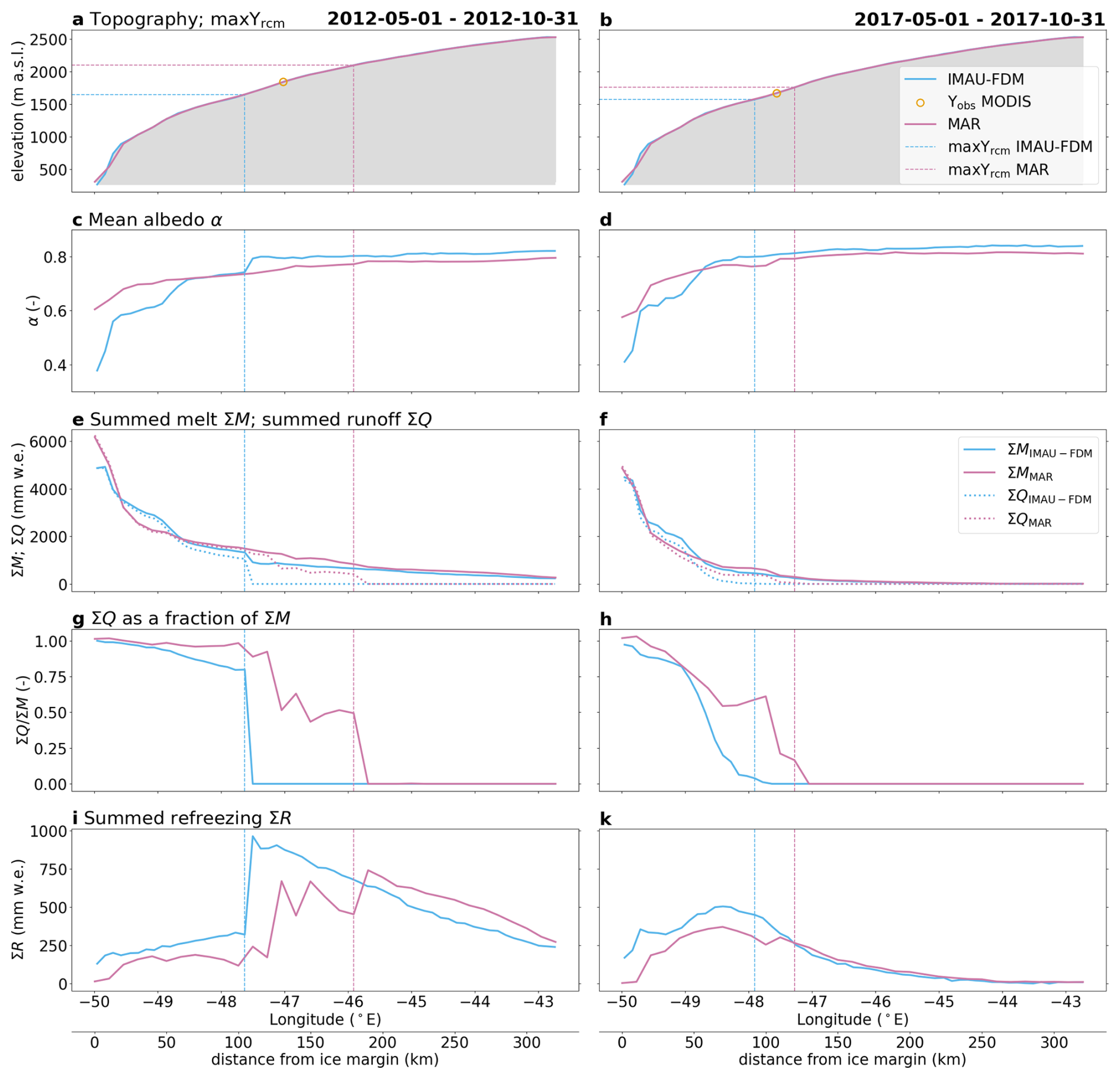Figures 5 and 6 visualize and compare RCM simulated parameters for the 2012 and 2017 melt seasons. Figure 5 shows average or summed values over the time period 1 May to 31 October and Fig. 6 illustrates the spatio-temporal evolution of parameters over the same time frame. In 2012, IMAU-FDM shows discontinuities at the location of : Mean albedo increases by ∼0.05 (Fig. 5c) while melt drops by ∼400 mm w.e. or 31 % (Fig. 5e). The contrast in albedo is even higher (an increase from 0.65 to 0.78) when averaging only from mid-July to mid-August 2012. At , runoff drops from slightly higher than 1000 mm w.e. to zero (Fig. 5e). Across , the percentage of melt running off drops from ∼80 % to zero (Fig. 5g). This sudden shut-down of runoff is compensated by an abrupt increase in refreezing (Fig. 5i). In 2012 these transitions take place over the distance of a single grid cell (5.5 km), whereas in 2017, IMAU-FDM shows gradual transitions without discontinuities. In 2012, MAR shows no discontinuities in albedo and melt across (Fig. 5c and e) but it exhibits step-wise changes in runoff and refreezing (Fig. 5g and i). These discontinuities are somewhat less pronounced than for IMAU-FDM. In 2017, simulated refreezing of MAR and IMAU-FDM are rather similar along the transect (Fig. 5k), regardless of being located at higher elevation.