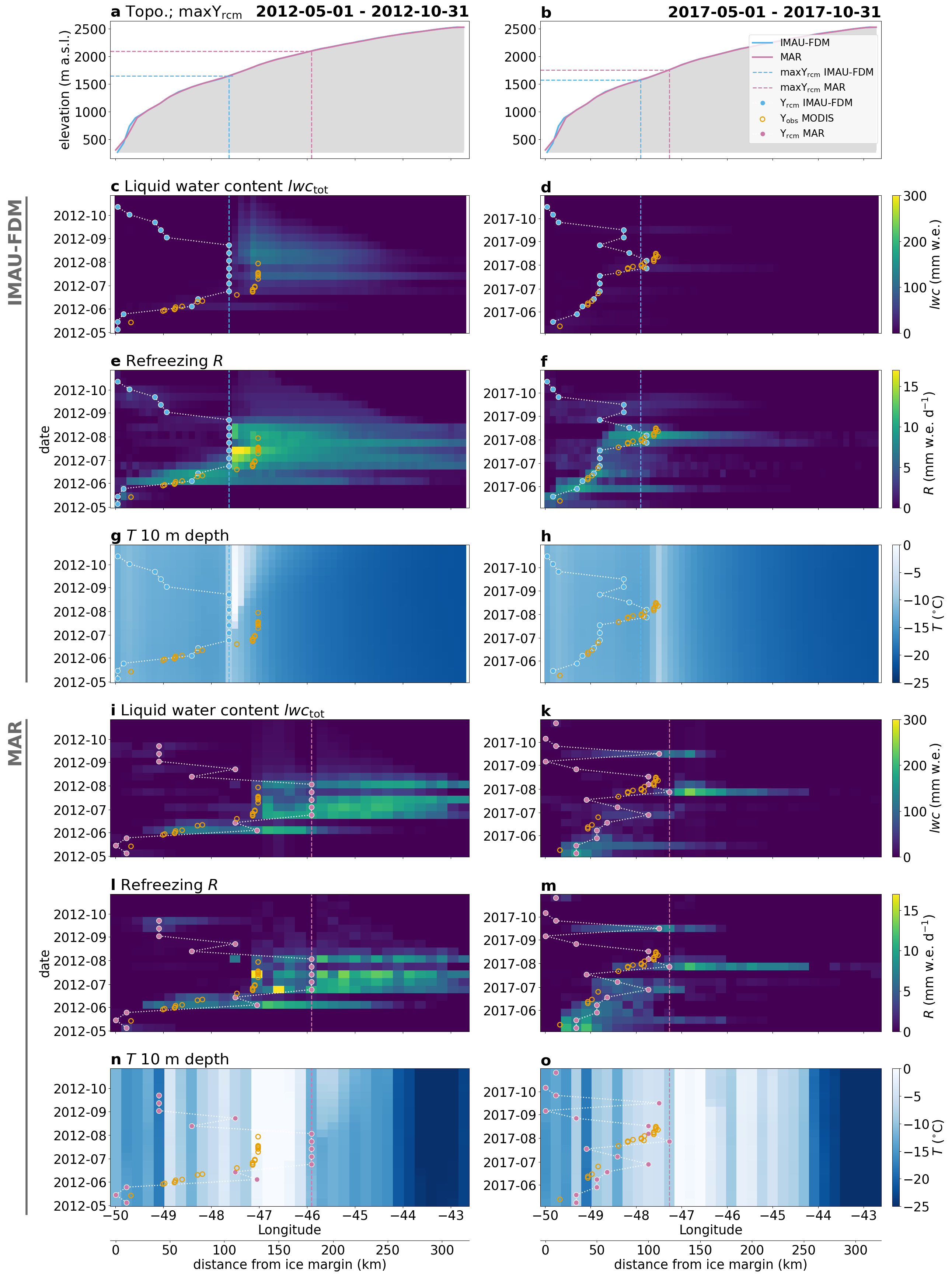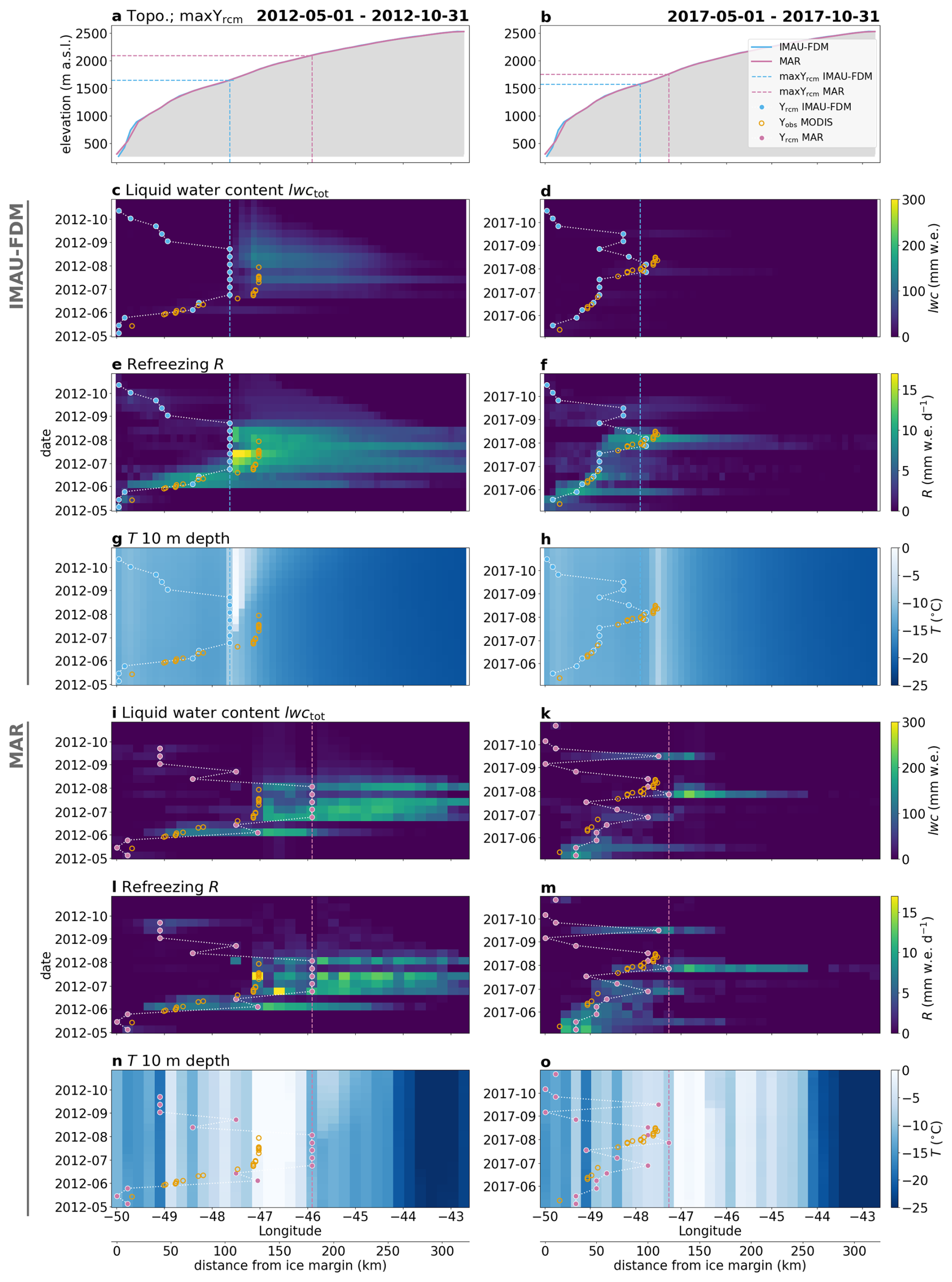 Figure 6Comparison of IMAU-FDM (subplots c to h) and MAR (i to o) simulated parameters along the K-transect. Subplots to the left refer to the 2012 melt season; 2017 is to the right. Refreezing and liquid water content (subplots c to f and i to m) are depth integrated over the top 20 m of the firn column. Blue and pink dots denote RACMO and MAR simulated seasonal evolution of the runoff limit, respectively. Orange circles show MODIS-mapped seasonal evolution of the visible runoff limit. All heat maps are given at 10 d temporal resolution. The parameters shown in each row of subplots are explained in the plot titles to the left.