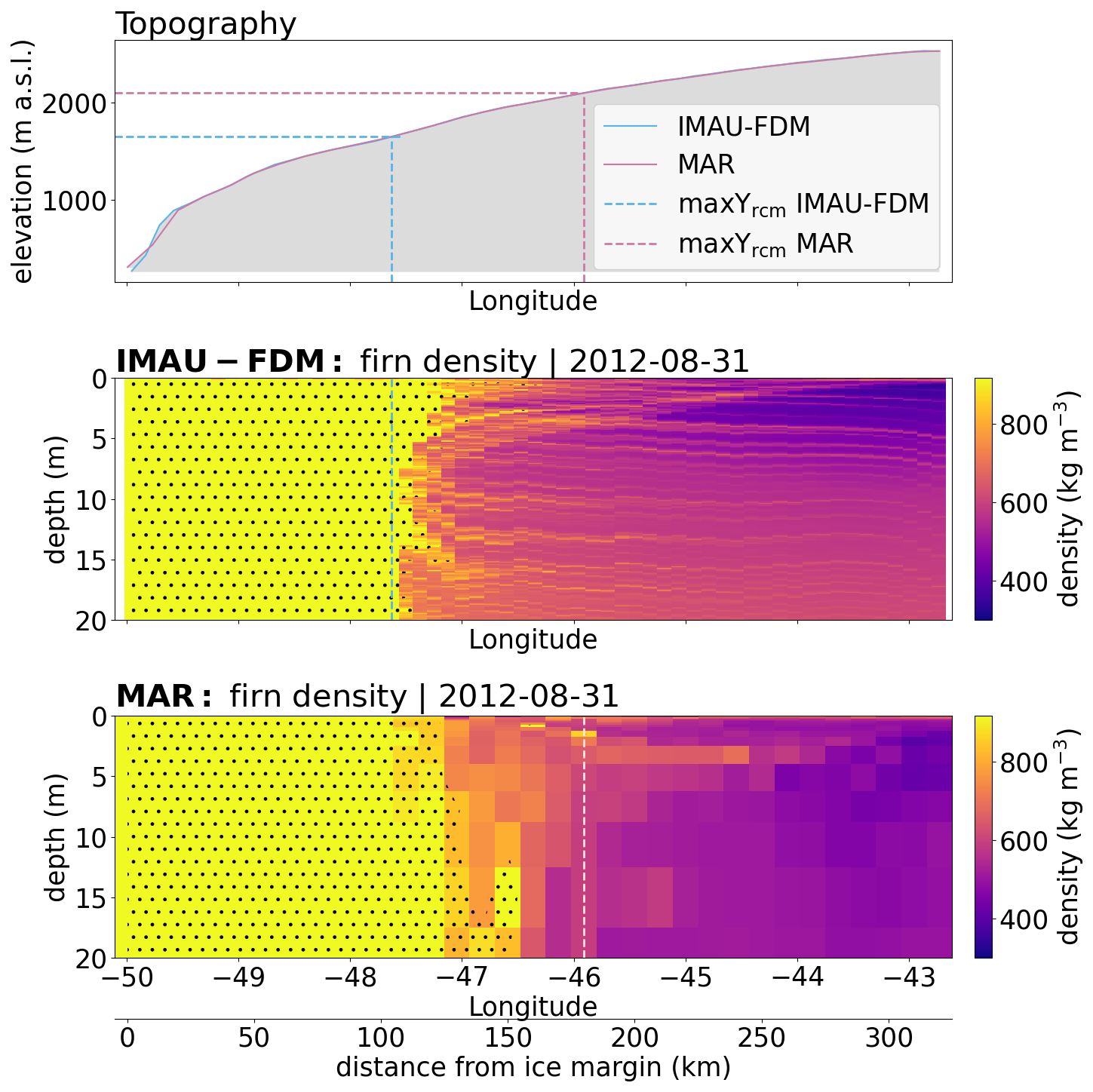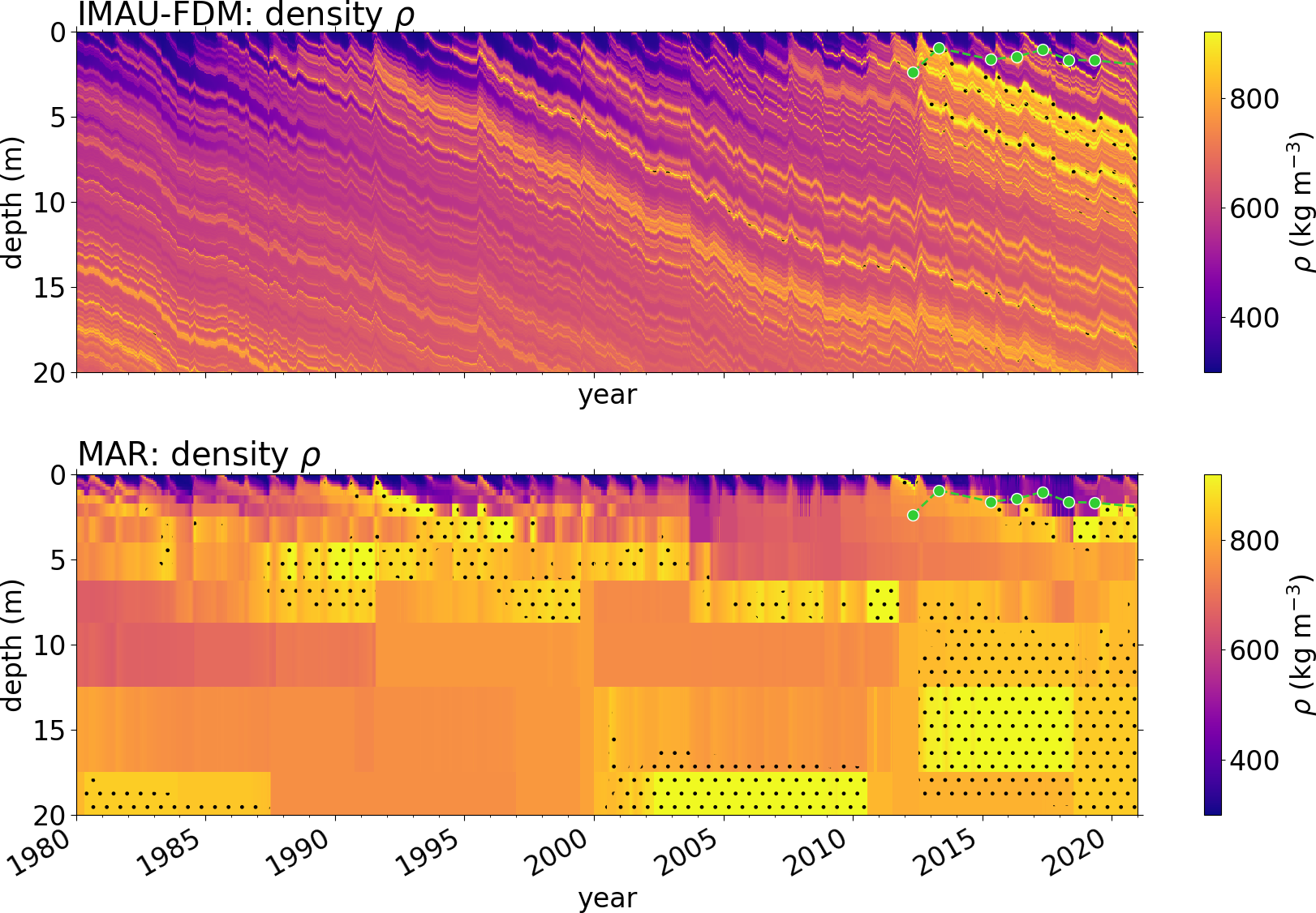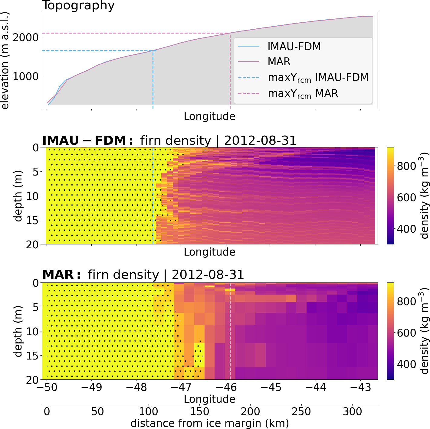 Figure 7 serves to assess whether maxΥrcm are related to simulated firn structure. In 2012, coincides with the uppermost grid cell where the top 20 m of the firn consist of ice. MAR maxΥrcm is underlain by less dense firn and is located much higher than the uppermost grid cell of uniform ice. Furthermore, we notice that the IMAU-FDM firn profile shows an ice slab, a zone of icy firn in the top ∼5 m of the firn profile overlying material of lower density. The slab is most pronounced directly uphill of the 2012 . The MAR firn profile shows a more weakly developed zone of increased near-surface density around and above the 2012 .