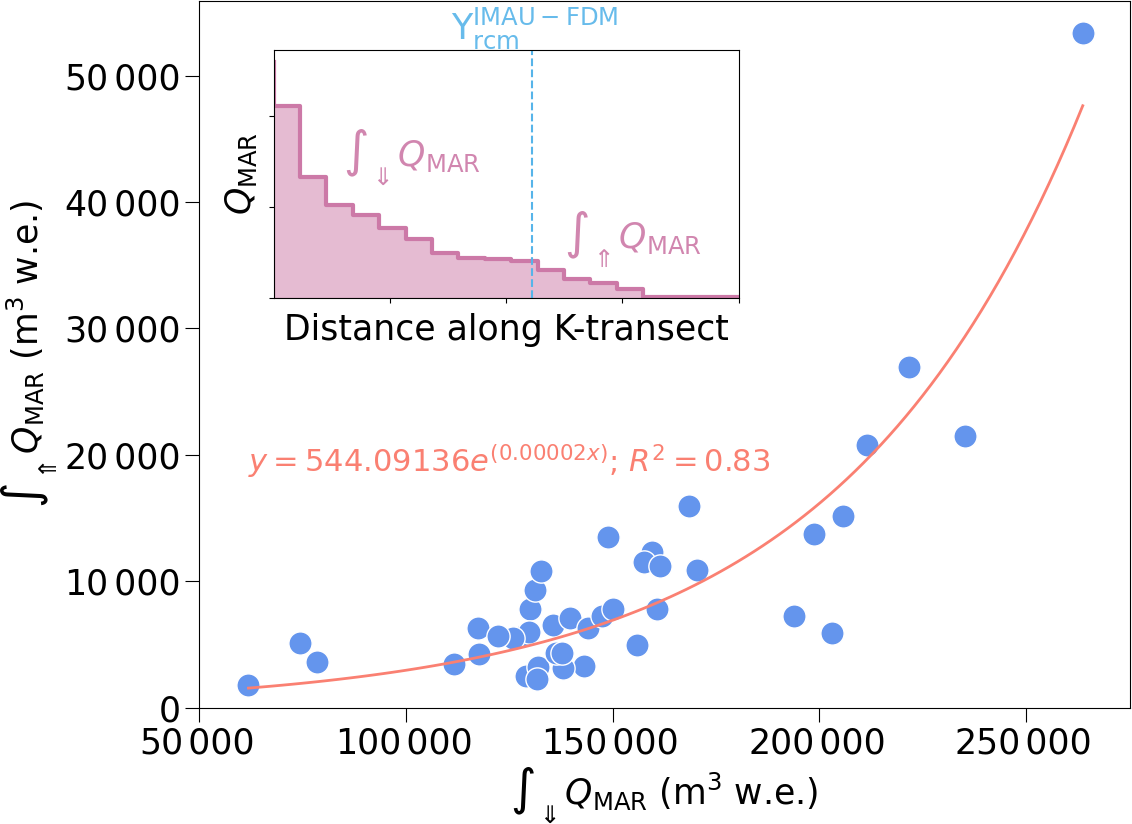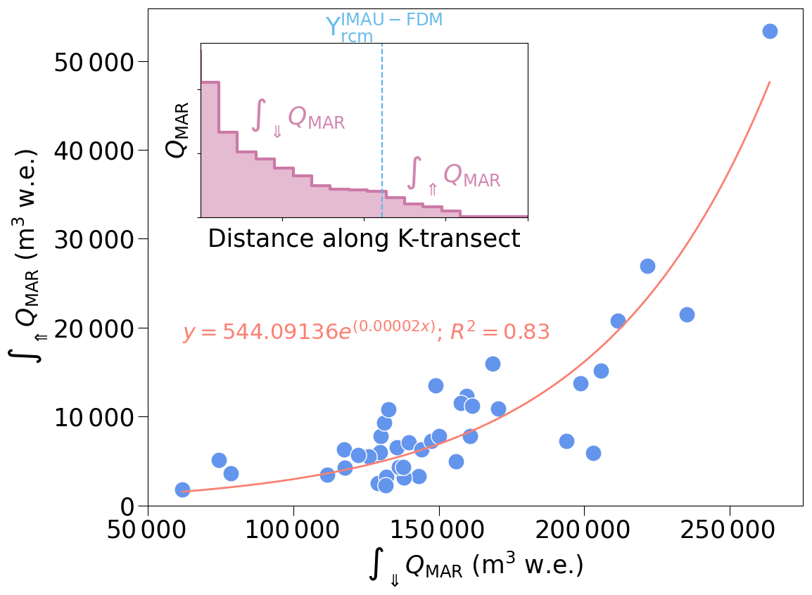 For each year from 1980 to 2020 we calculate total annual RCM runoff (i) below and (ii) above along the K-transect (see the inset in Fig. 8). We assume unit width for the transect so runoff has the unit m3 yr−1. The first value to be calculated, termed , can be derived for both RCMs. The second value, , can only be calculated from MAR whose maxΥrcm is always higher than IMAU-FDM along the K-transect.