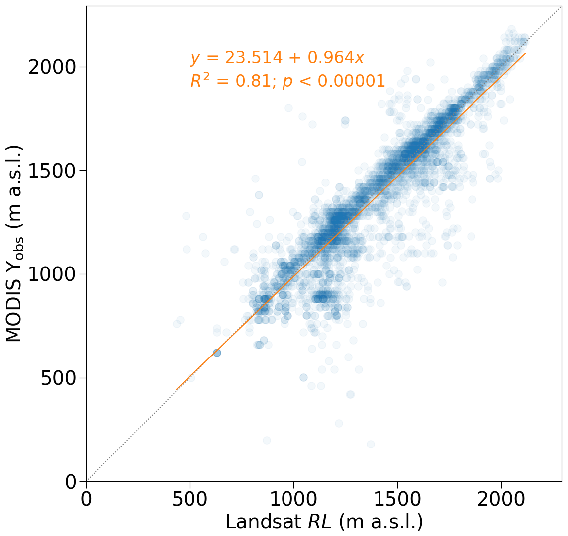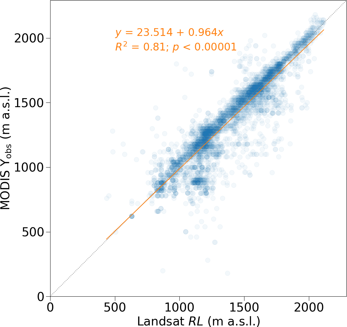 Figure A2 compares Υobs to the Landsat-derived visible runoff limits from Tedstone and Machguth (2022). The comparison yields a good agreement between the two data sets and is discussed in Appendix A4.