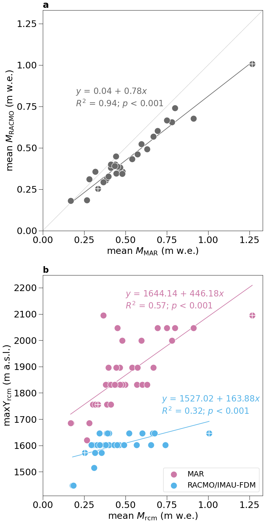 Our analysis focuses on the K-transect, which is located where differences in maxΥrcm are at their maximum (Fig. 3). However, other studies indicate our findings are valid elsewhere on the ice sheet. Spatial discontinuities in MAR firn temperatures were already shown to exist Greenland-wide by Vandecrux et al. (2024). Tedstone and Machguth (2022) focused on firn areas that experience surface runoff and found that 1985–2020 MAR and RACMO simulated cumulative runoff above a certain reference elevation differ by a factor of two. Given the relationship shown in Fig. 8 and our explanation why the difference between the two maxΥrcm increases with melt season intensity, we expect runoff limits to diverge further in a warmer future climate. Indeed, Glaude et al. (2024) show that by the year 2100, under identical SSP5-8.5 high emissions forcing, the runoff limits of RACMO and MAR differ strongly over most of the ice sheet. The consequence is a twofold larger simulated annual surface mass loss in MAR than in RACMO (Glaude et al., 2024).