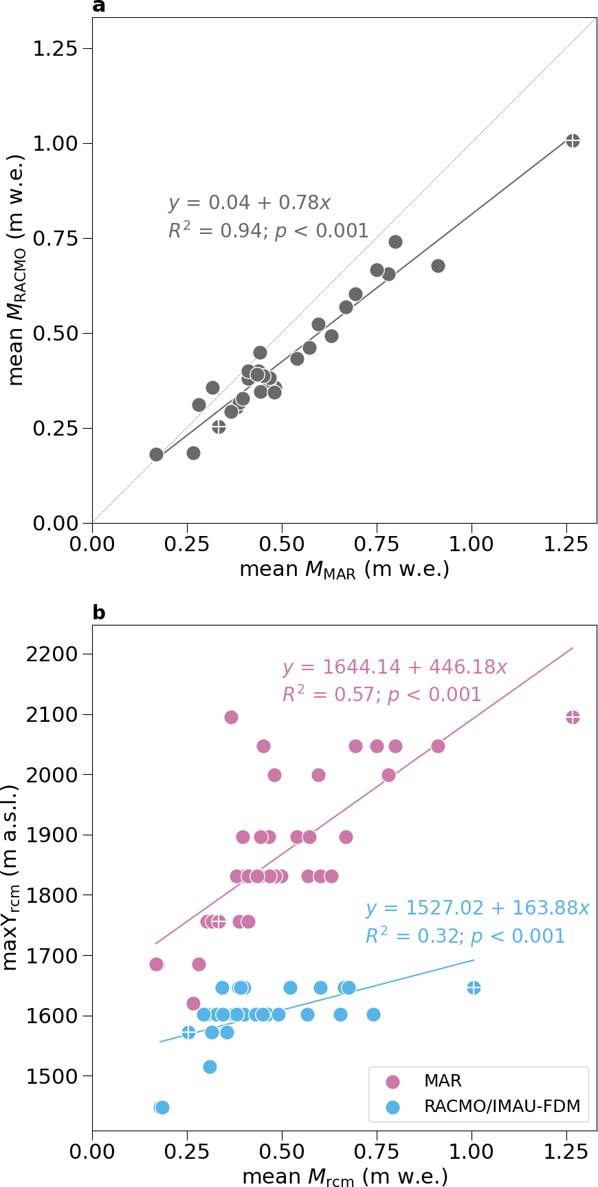 We observe a relationship between maxΥobs and maxΥrcm that is in broad agreement to Ryan et al. (2019) who compared snow lines simulated by MAR, RACMO and observed from remote sensing (cf. Fig. 4 herein and Fig. 5 in Ryan et al., 2019). Runoff limits and snow lines simulated by MAR are often high, but differences between melt seasons are in qualitative agreement with MODIS observations. On average, , as well as RACMO snow lines, fall below MODIS and variability from year to year appears suppressed.