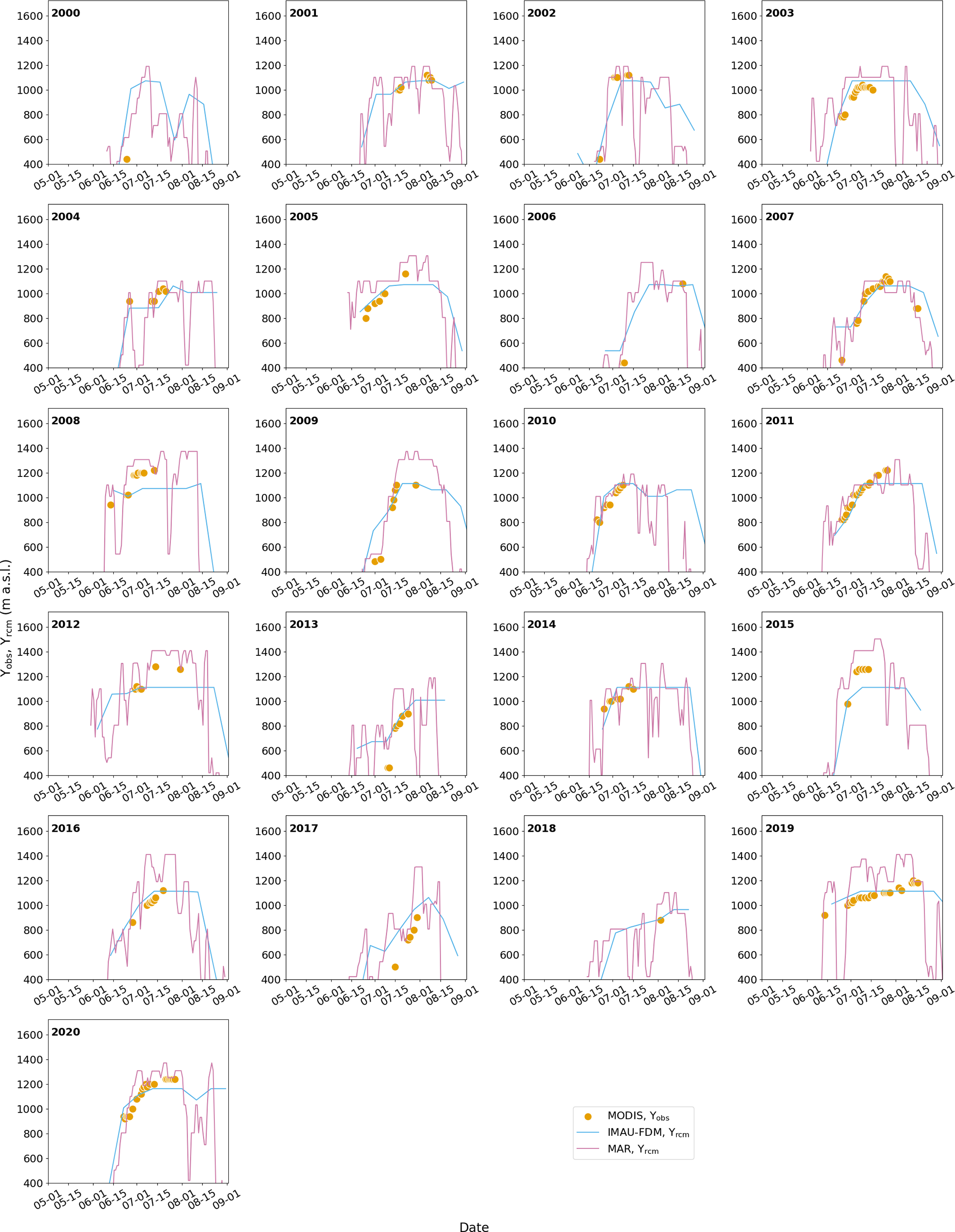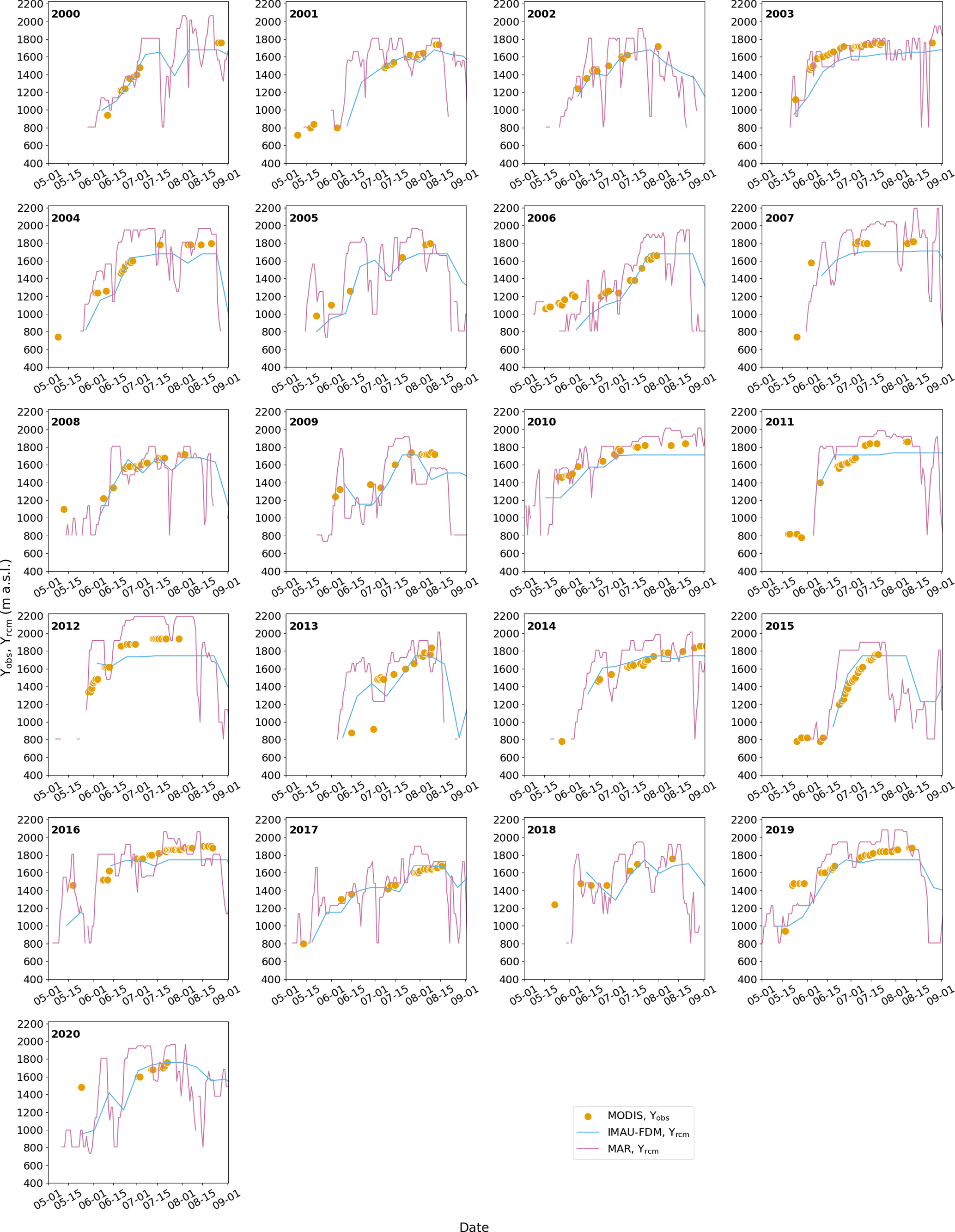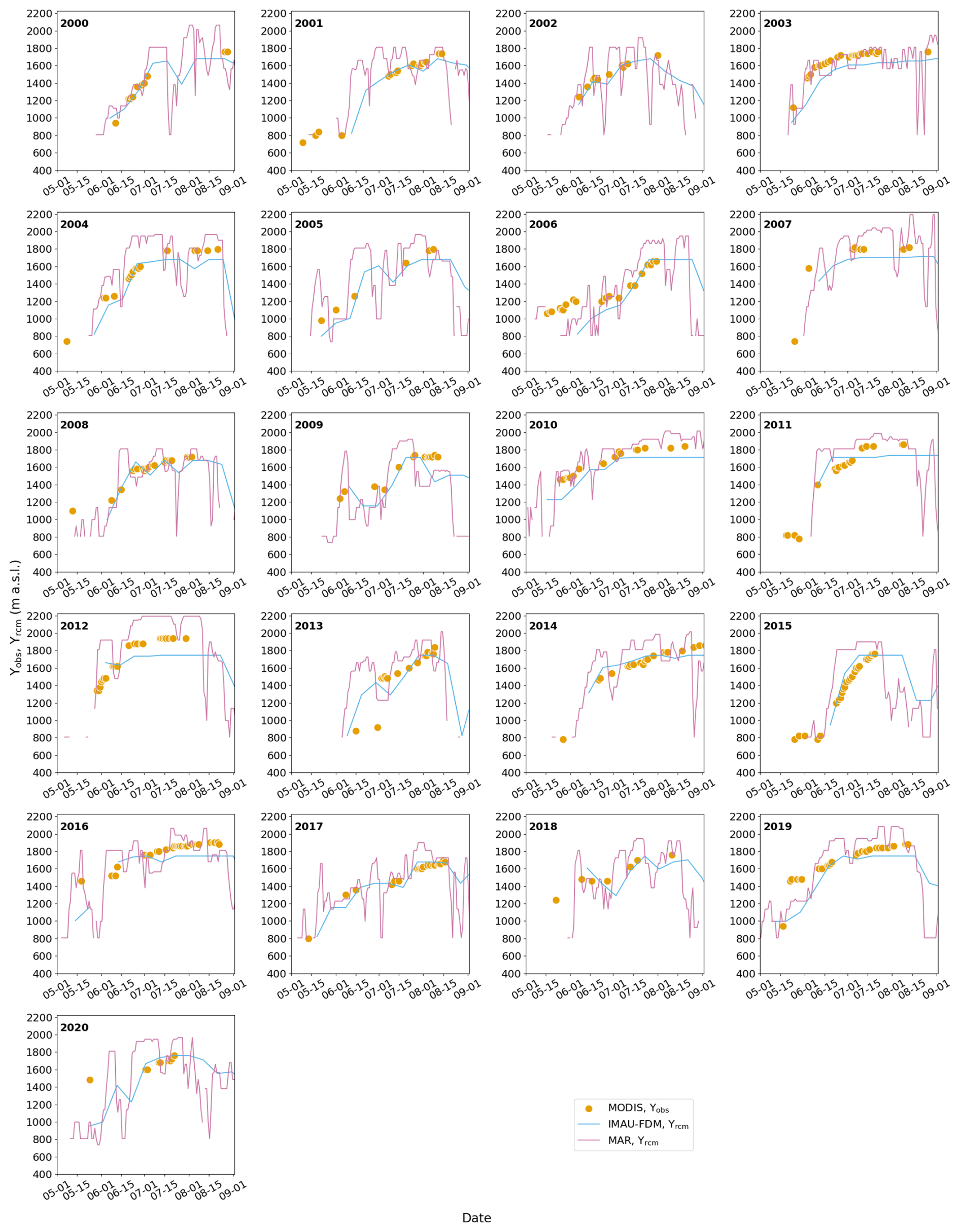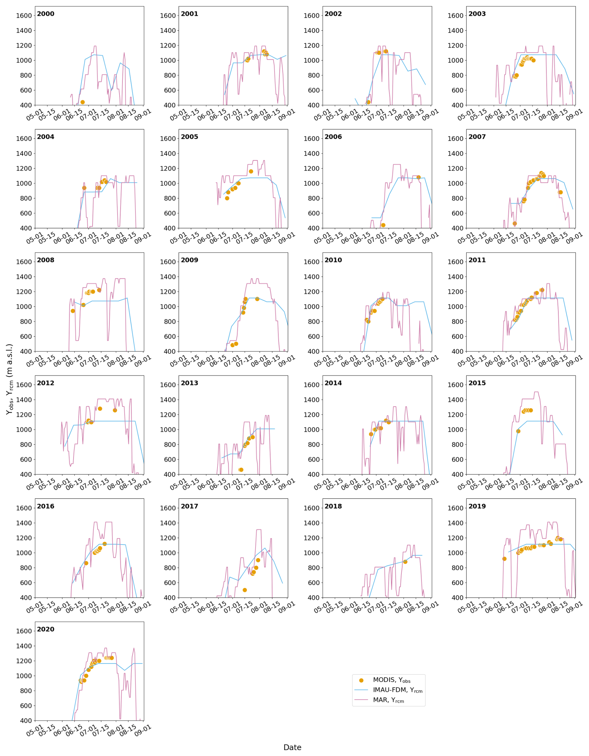 Agreement of to the seasonal evolution of Υobs is generally good (Figs. 2, C1 and C2). However, always tends to reach its maxima at very similar elevations, regardless of the intensity of the melt season. This is the same behavior shown for in Fig. 4. MAR Υrcm typically overshoot Υobs (Figs. C1 and C2).