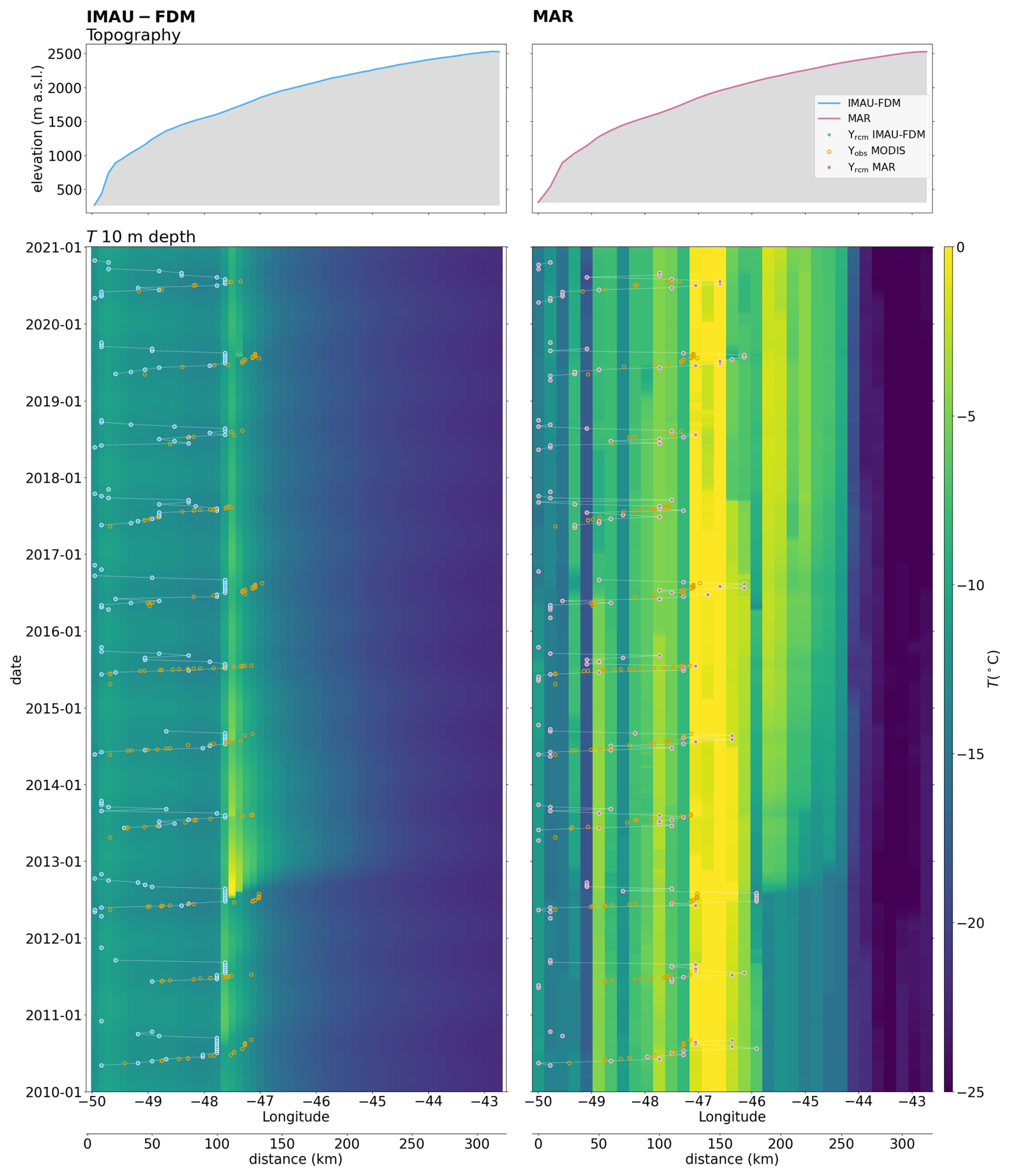 In 2012, remained stable over an extended time period (e.g. Fig. 6c). The sharp increase in total refreezing, observed in Fig. 5i, is the result of intense refreezing that took place during the prolonged time period when the IMAU-FDM runoff limit was at its maximum (Fig. 6e). The refreezing raised 10 m firn temperatures to 0 °C (Fig. 6g), which is unique for the decade 2010 to 2020 (Fig. C3). In 2012, MAR refreezing was also focused to directly above (Fig. 6l), but not as clearly as IMAU-FDM. The peak in MAR summed refreezing is thus less pronounced (Fig. 5i). We notice that MAR refreezing fluctuates somewhat randomly along the transect. These fluctuations can be observed in both years and occur mainly in-between the maxΥrcm of the two RCMs (Fig. 5i and k). The fluctuations can also be seen in Fig. 6l and m.
