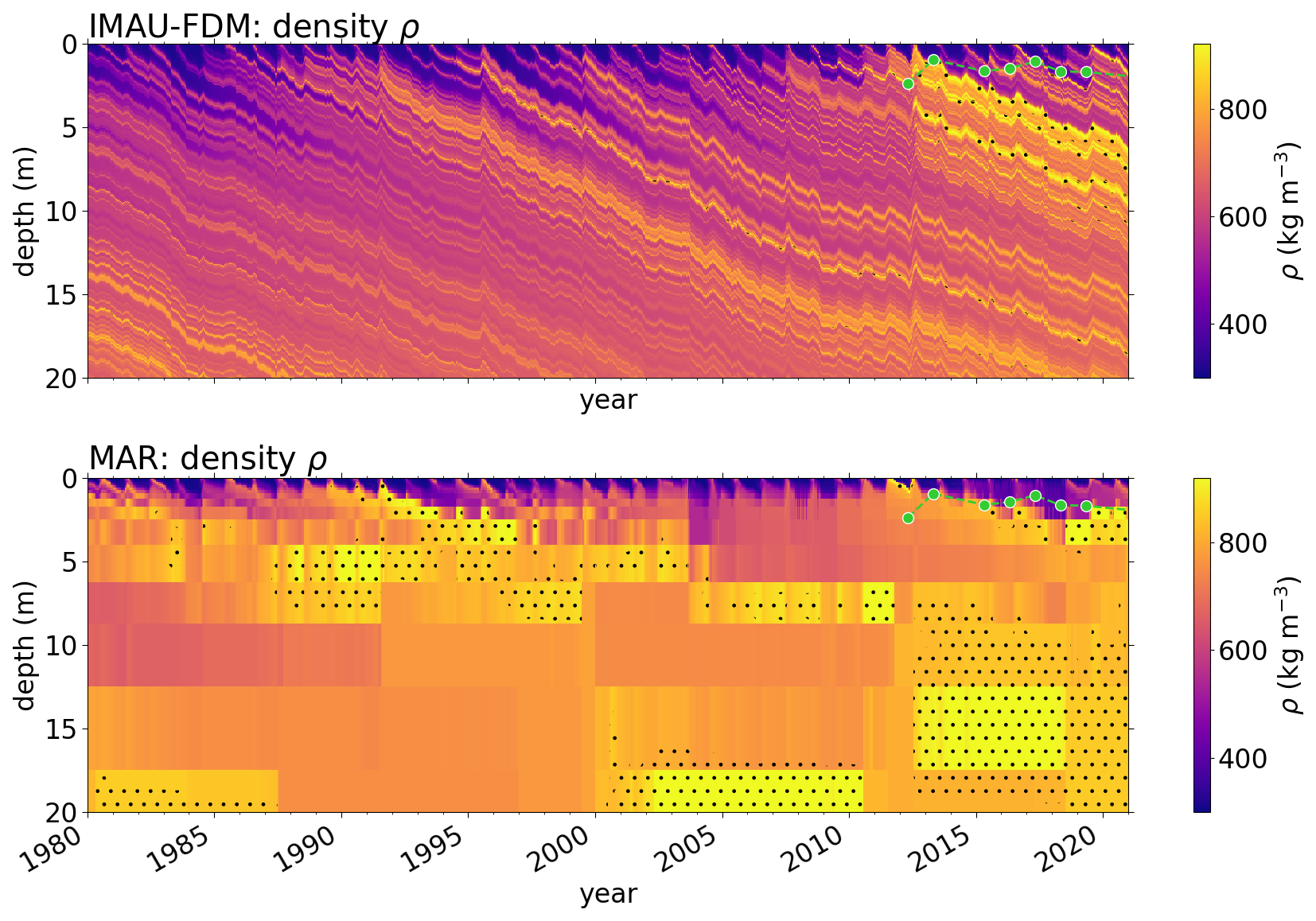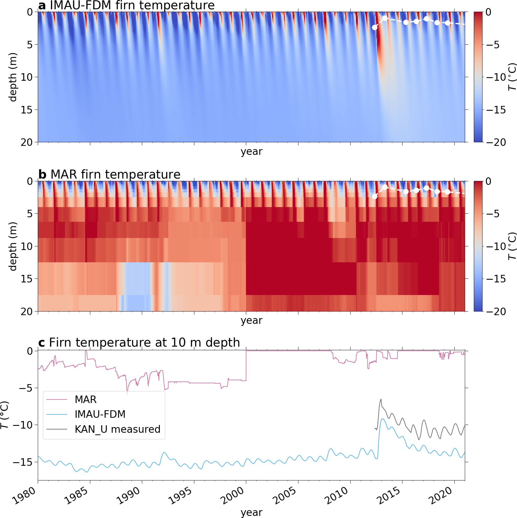 Firn properties simulated by MAR and IMAU-FDM differ in the vicinity of the maxΥrcm (Fig. 7), which mandates a more detailed comparison of firn properties. Along the K-Transect, KAN_U is the optimal site for such a comparison because (i) the site is located at 1840 m a.s.l. which places it above the highest and close to the average , and (ii) the site features repeated measurements of firn density (Rennermalm et al., 2021) and firn temperatures (e.g. Charalampidis et al., 2016; Vandecrux et al., 2024). Figure C4 visualizes simulated MAR and IMAU-FDM firn density evolution for the top 20 m over the time period 1980–2020 at KAN_U and Fig. C5 shows simulated firn temperature profiles and a comparison to measured 10 m depth firn temperatures. IMAU-FDM firn density evolution shows annual layers getting buried and an ice slab forming in summer 2012. Afterwards, the slab gets buried under accumulating snow and firn. In contrast to this, the observed depth of the top of the ice slab (Fig. C4a) remains close to the surface. The coarser vertical resolution of the MAR outputs makes it more difficult to follow horizons as they get buried. Simulated temperatures vary strongly at the site, being close to −15 °C in IMAU-FDM and around 0 °C in MAR. The former matches measured 10 m temperatures (around −11 °C; Fig. C5c) more closely.