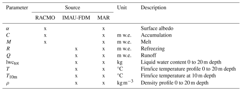 MAR output is obtained at daily temporal resolution. Output from RACMO and IMAU-FDM are at 10 d intervals. Where needed, MAR data are averaged or summed to the lower temporal resolution.