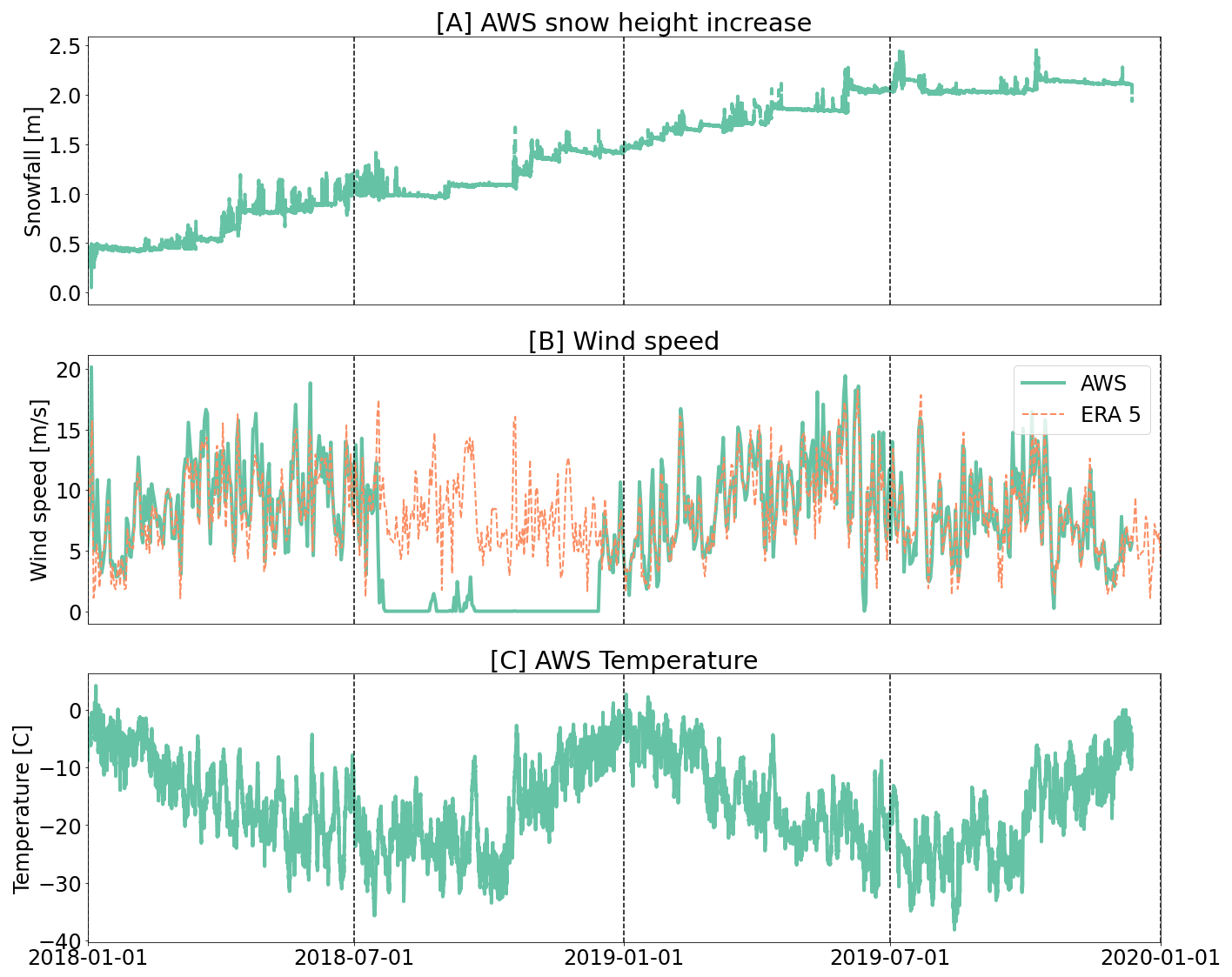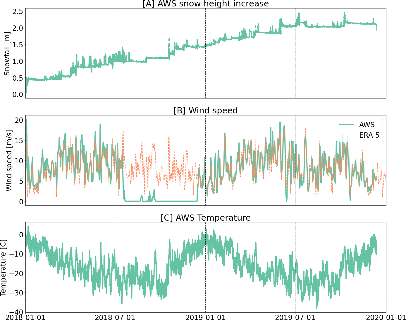 Two automatic weather stations (AWS) were deployed on the leeward (AWS1) and windward (AWS2) flanks of the LIR (Fig. 1) between 11 December 2017 and 6 May 2018 for AWS1 and between 11 December 2017 and 12 December 2019 for AWS2 (Kausch and Lhermitte, 2026). Both AWS's measured 2 m air temperature, relative humidity, wind speed and direction, incoming and outgoing shortwave and long wave radiation at the surface, as well as snow depth with a temporal resolution of 10 min. Since the wind sensor of AWS 2 failed to record any data between August and December 2018, we used ERA5 reananalysis data (Hersbach et al., 2020) to interpolate this gap in the wind data of AWS 2. The ERA5 wind data has a pixel size of 28 km and a bias of −0.45 m s−1 for the time periods where AWS data and ERA5 data are available, which is from January to July in 2018 and from January to October in 2019.