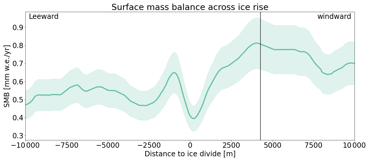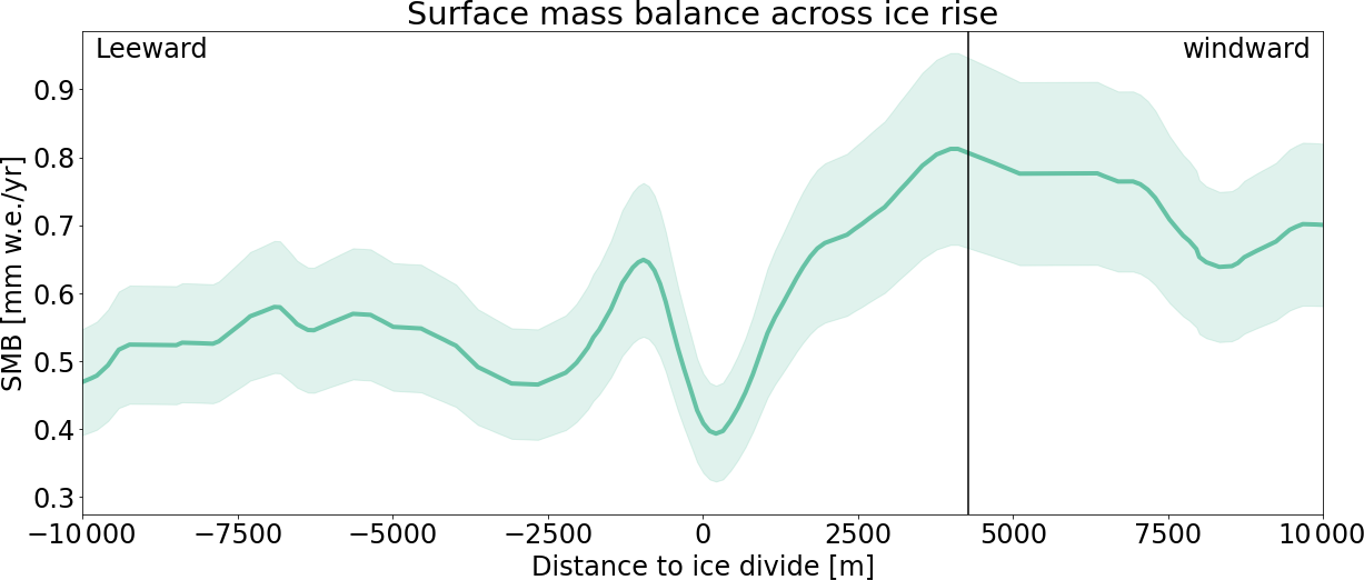 The average SMB was reconstructed from the ground-penetrating radar (GPR) measurements and the ice cores across the three ice rises using a method similar to Kausch et al. (2020) and Cavitte et al. (2022). Internal reflection ages, depths, and derived SMB are published in Cavitte et al. (2022). To summarize the method described in Kausch et al. (2020) and Cavitte et al. (2022) briefly, radar reflections are first dated using the ice core chronologies where they are closest to the ice core site. Radar reflection depths are measured in two-way-travel time from the surface. Conversion to real depth within the snowpack is done by iteration, by calculating the predicted reflection depths based on a best-fit Herron-Langway profile Herron and Langway (1980), the ages and depths of the dated reflections. The volume of snow accumulated between pairs of isochrones is then converted to an average SMB for the time period contained between each pair of isochrones. This is done for each radar data point of the radar surveys.