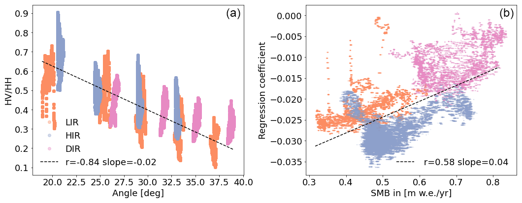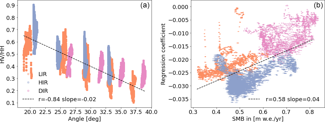 Figure 6(A) shows the empirical relationship between Sentinel-1 cross-polarization ratio and the SMB without incidence angle correction. At each point the SMB was reconstructed using the GPR data and the average cross-polarization ratio was sampled for that point. Orange points are located on LIR, blue on HIR and pink on DIR. (B) shows the same but post incidence angle correction. The dotted black line shows the linear regression across all points, with an R-value of 0.65 and a regression coefficient of 0.43 with a standard error of 0.0006. The orange dotted line shows the linear regression using only points from LIR, with an R-value of 0.73 and a regression coefficient of 0.66 with a standard error of 0.0013. The blue dotted line shows the linear regression using only points from HIR, with an R-value of 0.85 and a regression coefficient of 0.87 with a standard error of 0.0009. The pink dotted line shows the linear regression using only points from DIR, with an R-value of 0.36 and a regression coefficient of 0.37 with a standard error of 0.0021.