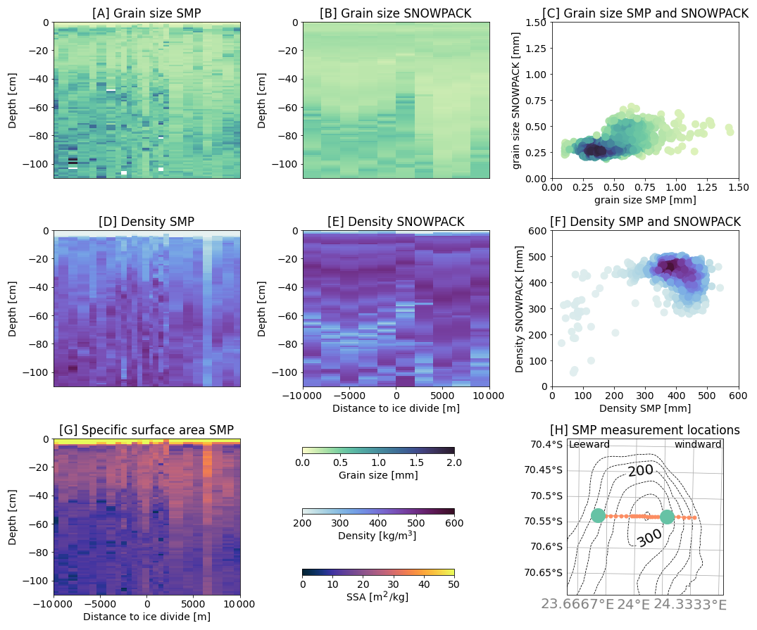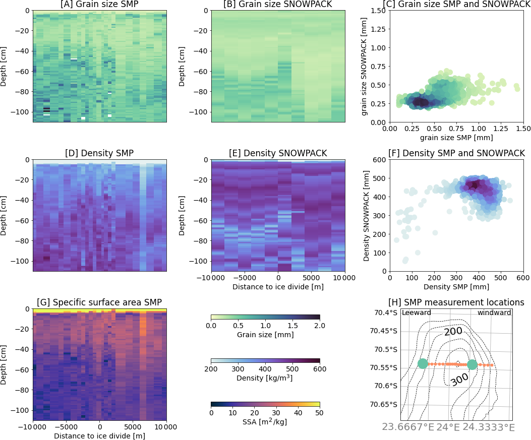 To evaluate the modelled snowpacks, we used the SMP field measurements across the ice rise (Fig. 5). One of the key snowpack parameters for modelling backscatter is snow optically equivalent grain diameter. Figure 5 shows the modelled SNOWPACK values compared with the SMP measurements (Fig. 5A, B, C). Figure 5 also shows that within the first 1 m of snow depth, SNOWPACK underestimates the optically equivalent grain diameter values observed by the SMP measurements near the surface. Furthermore Fig. 5 highlights that SNOWPACK does not fully capture small-scale variability observed in the SMP data.