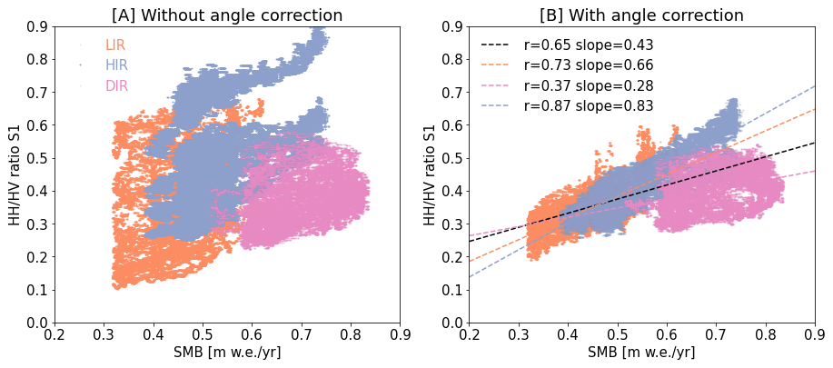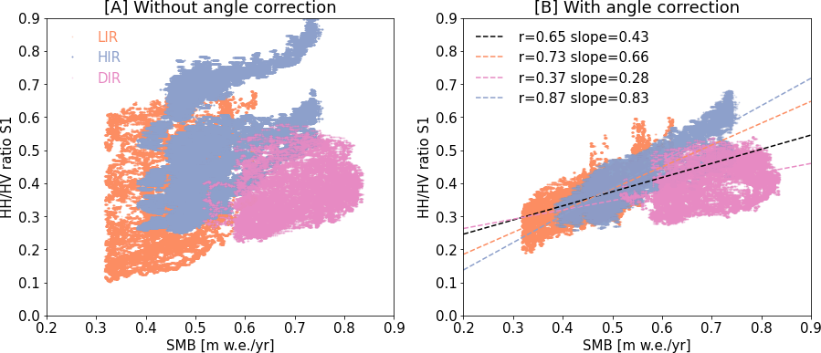 Figure 6A shows the relationship between the measured SMB and the uncorrected cross-polarization ratio of all available orbits for all three ice rises. The resulting plot shows little correlation between the SMB and the cross-polarization ratio, with an R-value of 0.20. After correction of the incidence angle, the correlation between the SMB and the cross-polarization ratio improves to an R-value of 0.63 (Fig. 6B). This improvement includes a minor increase in R-Value (∼ 0.01) as a result of the speckle filter. However, it also becomes clear from Fig. 6B that the relationship between the cross-polarization ratio and the SMB still differs between the ice rises, even after angle correction. LIR and HIR are fairly aligned with a variability of ∼11 %in regression coefficient after correction. However points from DIR differ more substantially with a variability of ∼62 % in regression coefficient, when compared to the average of LIR and HIR.