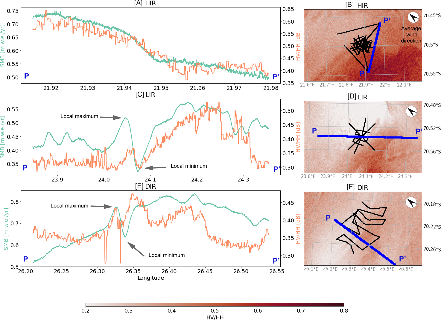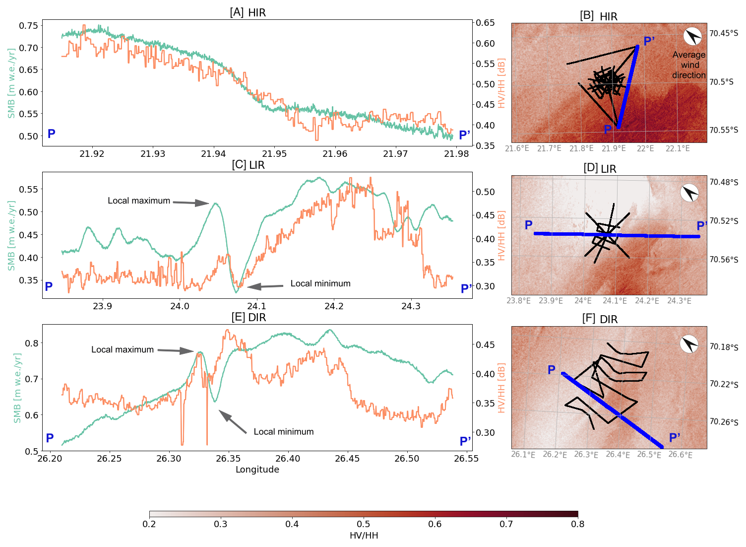Figure 7Panels (A), (C) and (E) show a comparison between the cross-polarization ratio (in orange) and the SMB profiles (in green) at HIR, LIR and DIR, respectively. Each profile follows a GPR straight track. The location of the GPR tracks is shown in black panels (B), (D) and (F). Panels (B), (D) and (F) also show the spatial distribution of the cross-polarization ratio around the GPR tracks. The wind direction shown in (B), (D) and (F) was measured by AWS2 and averaged between December 2017 and December 2019.