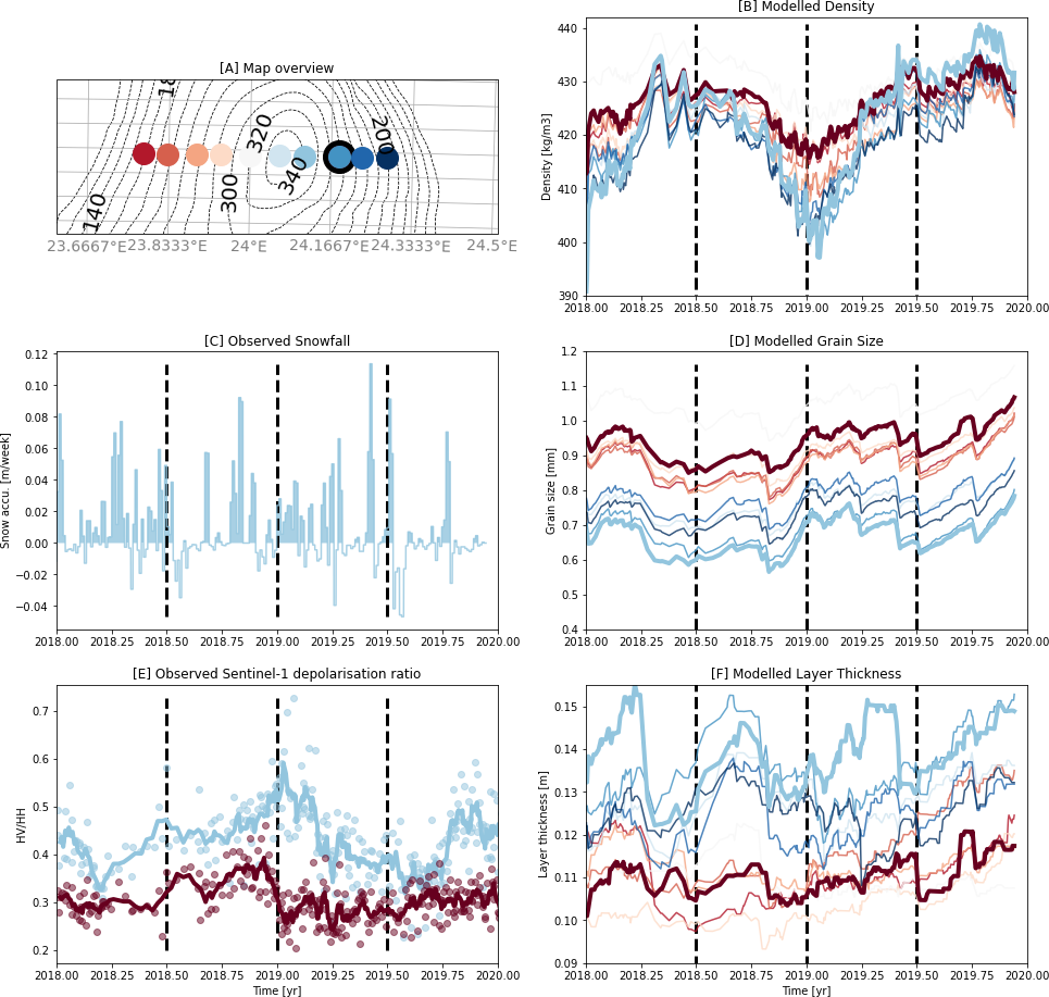 Figure 8Observed and modelled time series across LIR. (A) shows an overview map of the LIR. The black dot shows the location of AWS2, the colored dots represents the location of the time series shown in (B) to (F). (B), (D) and (F) show density, optically equivalent grain diameter and layer thickness time series as modelled by SNOWPACK. Each line shows the average density, optically equivalent grain diameter and layer thickness of the first 15 m depth at each modelled time step. (C) shows the snow accumulation per week measured by AWS2. (E) shows the Sentinel-1 angle-corrected cross-polarization ratio on each side of the ice rise. A vertical dotted line marks every half year on panels (B)–(F).