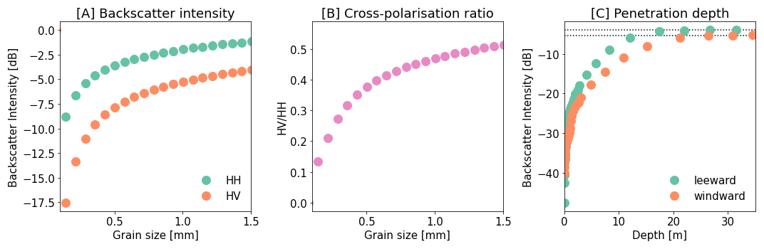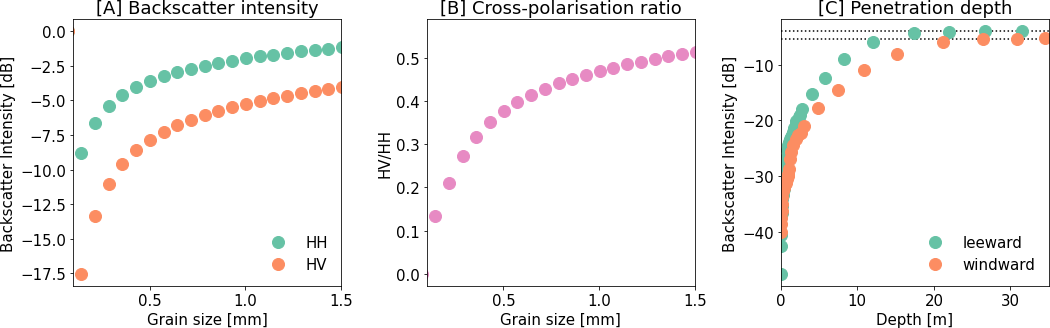Figure 9Synthetic backscatter intensity modelled with SMRT. (A) shows the modelled σHH and σHV intensity with increasing optically equivalent grain diameter. (B) shows the with increasing optically equivalent grain diameter. (C) shows the increase in σHH when including deeper layers on the windward and leeward side of LIR. The dotted lines in (C) represent the Backscatter intensity of the complete snowpack, to highlight at which point the Backscatter intensity is no longer increasing.
