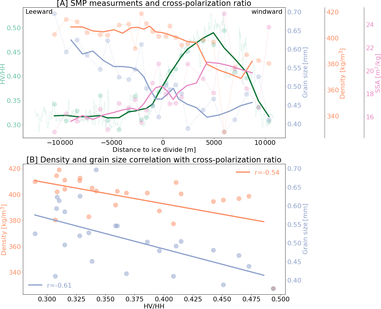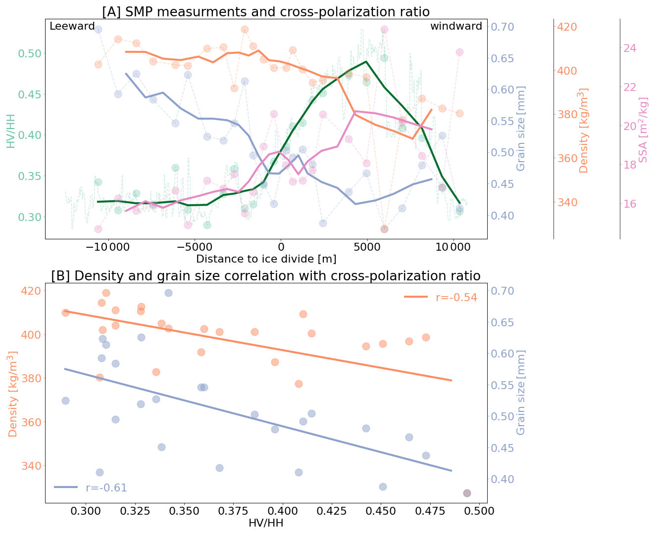 Figure 10(A) SMP measurements compared to the cross-polarization ratio across LIR in a east to west profile across the LIR. SMP measurements include the average optically equivalent grain diameter, density and SSA of the first meter of snow. The points are the actual measurements and the solid lines are running means with a 4 point window for the SMP measurements and a 80 pixel running mean for the Sentinel-1 cross-polarization ratio. The location of the SMP measurements is shown in Fig. 5H. (B) shows the correlation between the the cross-polarization ratio and the optically equivalent grain diameter (blue) and the density (orange) measured by the SMP.