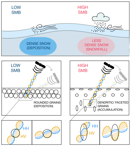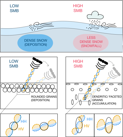 Satellite remote sensing presents an attractive alternative way of quantifying SMB, because of its frequent revisit times (up to weekly and daily) and higher spatial coverage with a spatial resolution of 20×40 m (Sentinel-1 Extra Wide swath) and up to 2×1 m in certain cases (TerraSAR-X Spotlight mode). Synthetic Aperture Radar (SAR) is especially attractive as its signal is sensitive to snow micro-structure (Mätzler, 1998; Joughin et al., 2016; Lievens et al., 2019), independent of sunlight and less restricted by cloud cover. The SAR signal penetrates several meters into the snow and interacts with the surface layer, internal layers as well as individual grains within the snowpack. As a result of these multiple interactions, it is difficult to derive SMB directly from SAR-derived observations. Nevertheless, an increasing amount of successful applications have been developed that derive snow parameters from satellite radar data: e.g. retrieving snow depth based on the co-polar phase differences (CPD) of TerraSAR-X acquisitions (Patil et al., 2020) or relating interferometric radar signals to physical snow properties (Rott et al., 2021). Recently CPDs have also been used to successfully derive firn thickness values in western Greenland (Parrella et al., 2021). One particularly promising approach used the cross-polarization ratio of Sentinel-1 to map snow depth on the whole northern hemisphere (Lievens et al., 2019). This approach builds on the assumption that the cross-polarization ratio increases with snow height as a result of the longer travel path of the radar signals through the snow column. The longer travel path allows for more multiple and anisotropic scattering, which increases the cross-polarized part of the signal (σVH). Although this approach is promising, it can not be directly translated to Antarctica, as it depends on the radar signal penetrating through the whole snowpack and returning from the ground and requires data which are not widely available over Antarctica. Lievens et al. (2019), however, highlights that the radar wave interactions within the snowpack and the volume scattering response of the snowpack are what is driving cross-polarization ratio variability. Furthermore, it highlights that important variables such as snow height can be derived from these interactions.