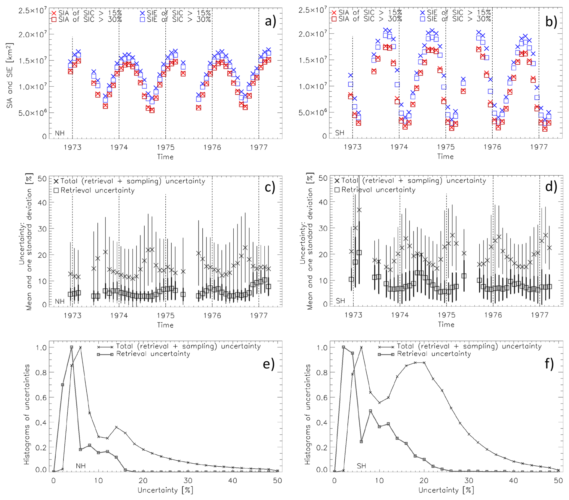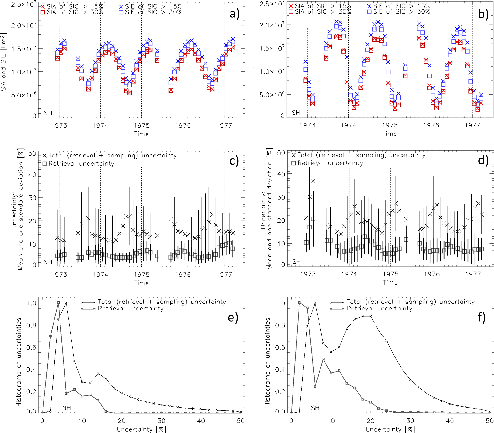 The histograms of the daily retrieval and total uncertainties (Fig. 1e and f) illustrate that at daily temporal scale the retrieval uncertainties exhibit a dominant mode at around 3 % in both hemispheres. The tail towards higher retrieval uncertainty values extends towards higher values in the Southern Hemisphere. Similarly, the total uncertainty exhibits a dominant mode at 6 % in both hemispheres. This mode is followed by a relatively weak secondary mode at 14 % in the Northern Hemisphere and a very well pronounced secondary mode at 20 % in the Southern Hemisphere, in line with the differences in the time series of the monthly mean uncertainties presented in Fig. 1c and d. Note that all uncertainties I wrote about in this last paragraph are provided together with the SIC product, resulting from the processing.