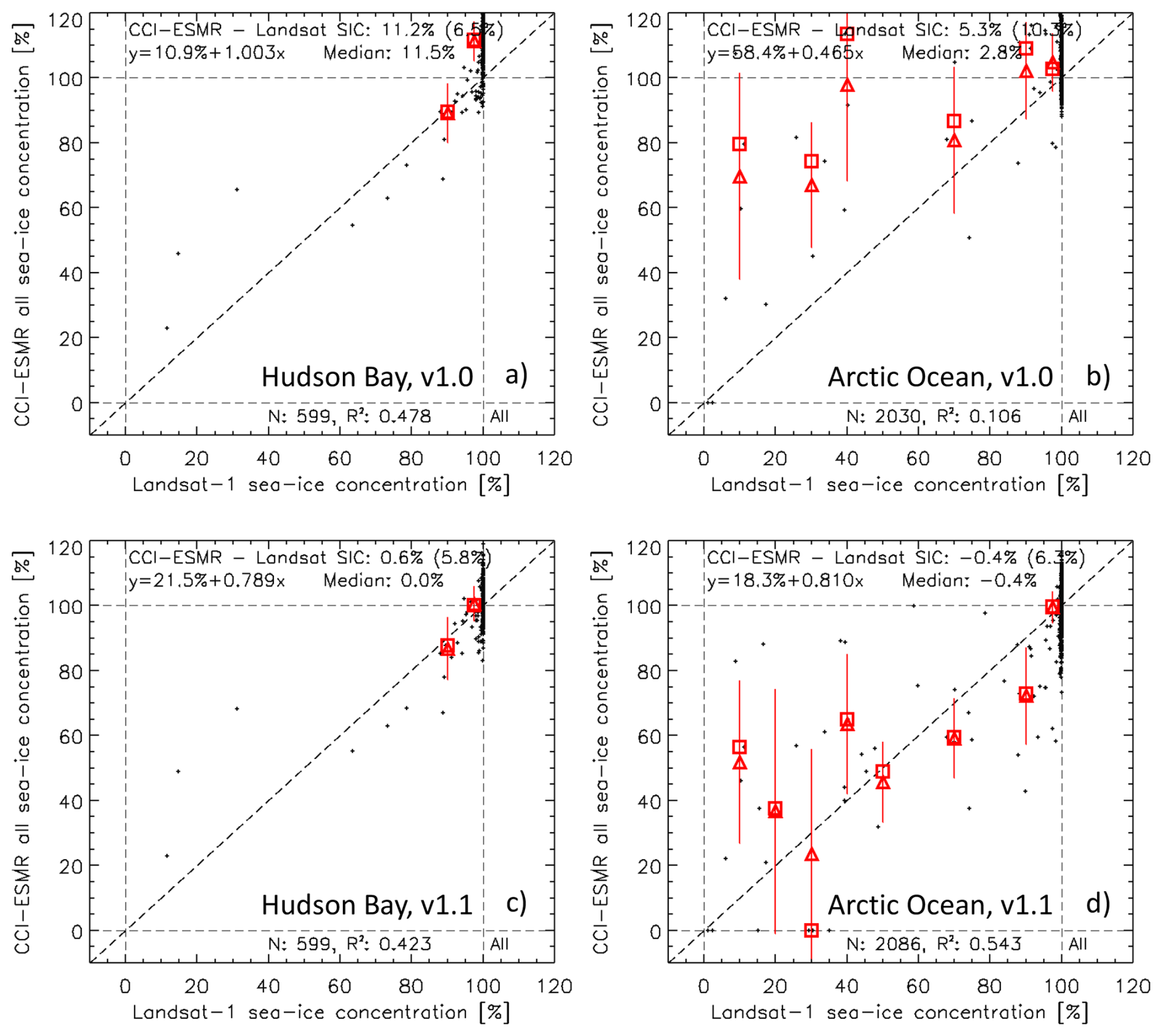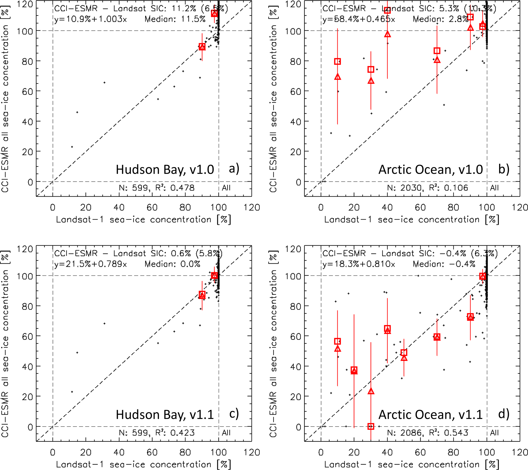 Figure 3Scatterplots of the comparison between daily ESMR SIC and Landsat-1 SIC using the non-truncated ESA CCI+ ESMR SIC product v1.0 (a, b) and v1.1 (c, d) for the Hudson Bay (left hand side) and the Arctic Ocean (right hand side). Scatterplots are superposed with the mean-per-bin ESMR SIC (triangles) and with the median-per-bin ESMR SIC (squares); bins used are Landsat-1 SIC; a minimum of three values is required for the mean or median values. All scatterplots show the mean difference (one standard deviation) in the top right, the equation of the linear fit in the top left and at the bottom, the number of grid cells N and squared value of the linear correlation coefficient R2.