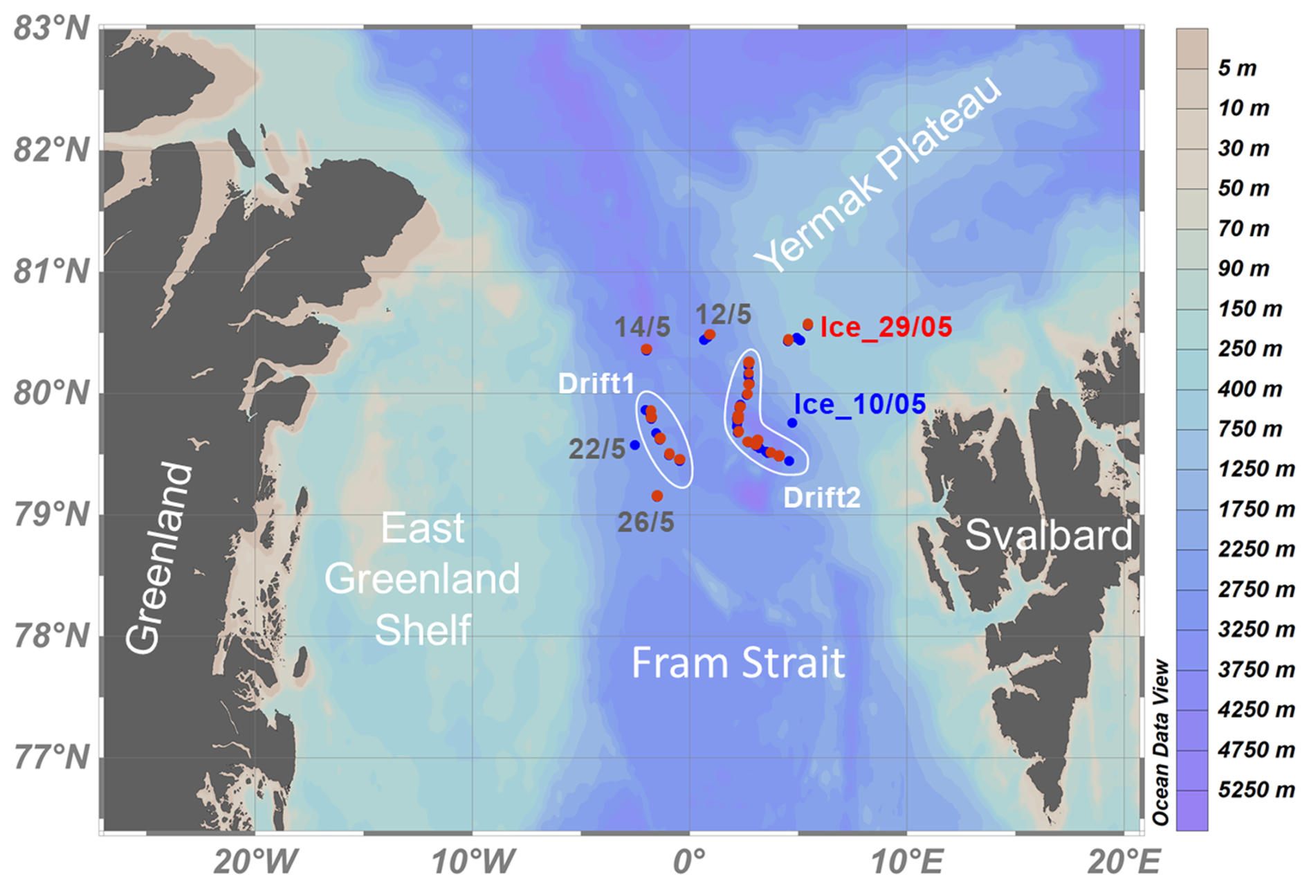 Figure 1Study area in the Fram Strait between Greenland and Svalbard. White bordered regions indicate IB ODEN's position during the two ice drift stations. Red dots indicate VMP stations, and blue dots indicate CTD stations. Grey labels indicate stations without CH4 and N2O data but CTD and/or Vertical Microstructure Profiler (VMP) measurements. Map generated using Ocean Data View Schlitzer, Reiner, Ocean Data View, http://odv.awi.de, 2023.