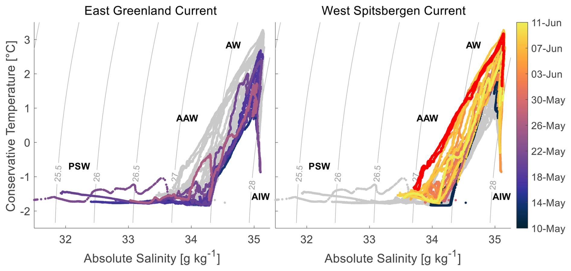 Figure 2Water mass distribution in the Fram Strait during the study period, identified by absolute salinity, conservative temperature, and density for the EGC (left) and WSC (right), based on all VMP and CTD measurements. Red data points indicate measurements from 5 June. PSW = Polar Surface Water, AW = Atlantic Water, AAW = Arctic Atlantic Water, AIW = Arctic Intermediate Water.