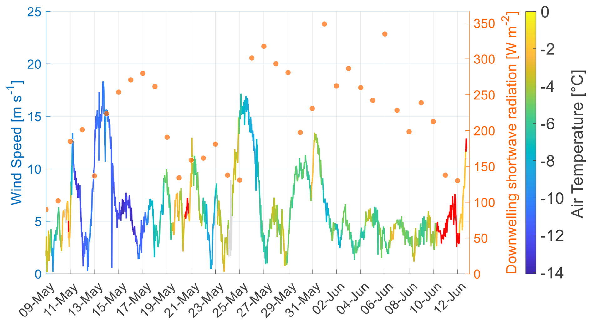 Murto, Sonja, Tjernström, Michael, Karalis, Michail, and Prytherch, John: Wind, temperature, relative humidity, surface temperature and radiation from expedition ARTofMELT, Arctic Ocean, 2023, https://doi.org/10.17043/ODEN-ARTOFMELT-2023-WEATHER-STATION-1, 2024.