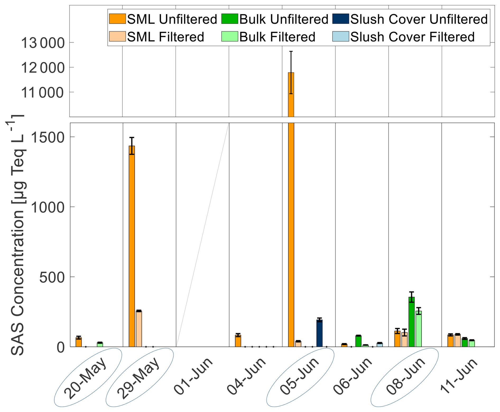 SAS concentrations during this study showed a high variability depending on the sampling site (Fig. 5). Water samples from ice holes (4, 6, and 11 June) showed generally low concentrations with 19–89 µg Teq L−1 in the SML, 13–80 µg Teq L−1 in the ULW, and 4 out of 12 samples were below the detection limit (< 10 µg Teq L−1). Lead samples showed higher concentrations and ranged from 39–11788 µg Teq L−1 in the SML and from 29–355 µg Teq L−1 in the ULW (6 out of 16 samples were below the detection limit). On 5 June, the highest concentrations (11788 µg Teq L−1) occurred with strong enrichment in the SML compared to the ULW (below detection limit). The filtered SML sample from this station exhibited a significantly lower concentration of 39 µg Teq L−1, representing the highest difference between filtered and unfiltered samples observed in this study. At this station, floating slush ice from the lead surface was collected and showed a SAS concentration of 192 µg Teq L−1. The second highest concentration was found in the SML on 29 May (1435 µg Teq L−1) in a lead during a wind speed of 10 m s−1. Only on 6 June (ice hole) and 8 June (lead), SAS concentrations in the ULW exceeded those in the SML.