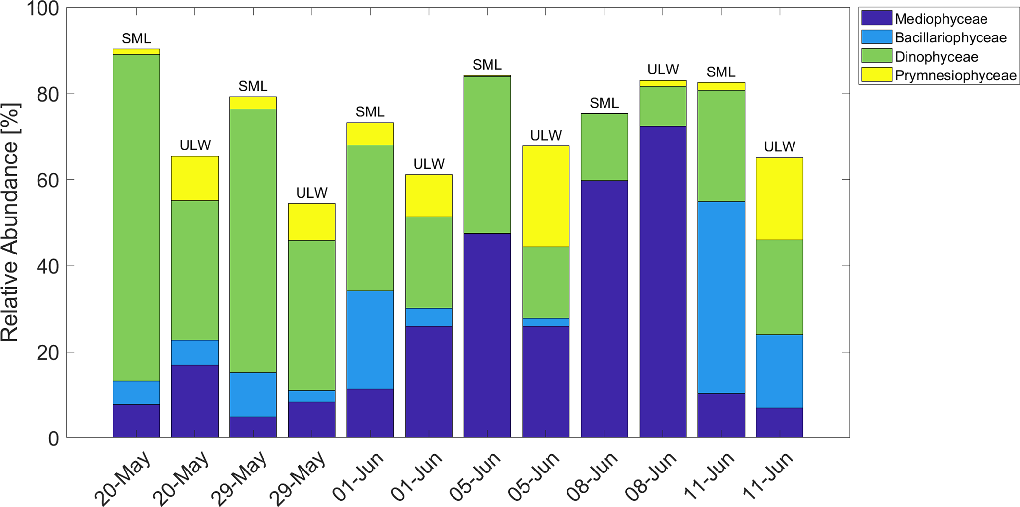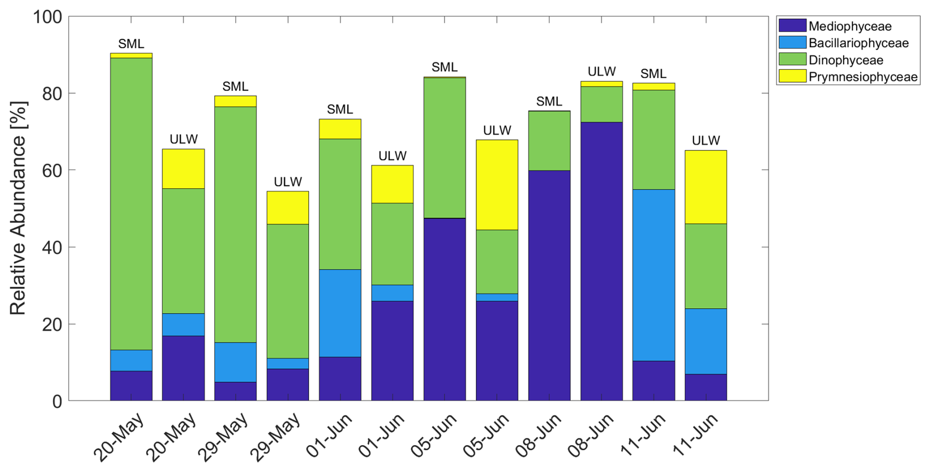 Figure 6Relative abundance of selected phytoplankton classes over time in the SML and ULW. Prymnesiophyceae were dominated by Phaeocystis.