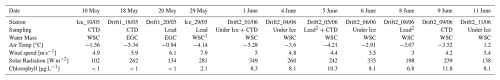 The collected hydrographic data showed clear signs of the EGC and the WSC (Fig. 2). The first sampling and measurements of this study (10 May) were conducted closest to Svalbard but off the shelf in the deep waters of the Fram Strait (Fig. 1 and Table 1). This water mass can be associated with the WSC. On 12 and 14 May, CTD and VMP measurements were conducted in the northern central part of the Fram Strait, marking the transition between the WSC and the EGC. Between 17 and 21 May (first drift station), the ship drifted southeast with the ice. Here, CTD/VMP casts and one ice station sampling were conducted in the waters of the EGC. From 24 to 27 May, a storm event occurred with wind speeds of up to 17 m s−1. After a transit to the northeast of the Fram Strait, measurements and sampling were continued on 28/29 May on the Yermak Plateau north of Svalbard, in the waters of the WSC. Subsequently, the second drift station was established, and sampling was conducted regularly between 31 May and 11 June. A full description of the observed water masses and section plots for salinity and temperature for all VMP profiles are in the Supplement (Fig. S3). Recorded air temperatures (Fig. 3) showed a cold phase between 11 and 18 May (<−10 °C air temperature), followed by a warmer phase (−8 to 0.4 °C) until 10 June. Afterwards, the air temperatures rose above 0 °C, reaching 1.8°C on 12 June. However, melting of sea ice seemed to have started already on 5 June, as slush and meltwater appeared on top of the ice (observed during ice work on that day).
