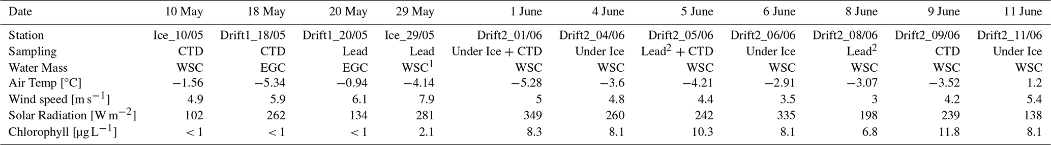 Table 1Overview of sampling stations and locations, daily mean meteorological conditions (Murto et al., 2024), and chlorophyll concentrations from VMP data (average of the upper 5 m). 1= sampled on the Yermak Plateau, 2= sampled at off-ship stations accessed by helicopter.