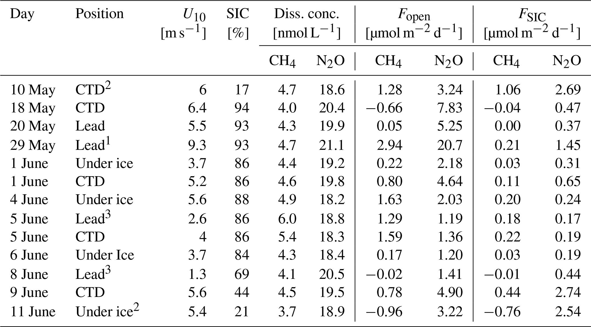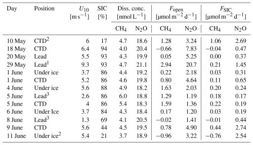 Table 2Overview of dissolved CH4 and N2O concentrations and comparison of sea-air fluxes considering open water (Fopen) and sea ice coverage (FSIC, SIC data from E.U. Copernicus Marine Service Information, 2025). 1= sampled on the Yermak Plateau, 2= sampled close to the ice edge, 3= off-ship stations, U10= wind speed at 10 m, SIC = Sea Ice Coverage, Diss. conc. = dissolved concentration, Fopen= sea-air gas flux for open water, FSIC= sea-air gas flux considering SIC.